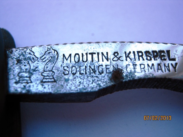 Moutin & Kirspel , Solingen in 1920, 1922 and 1925, Kasernenstrasse 24 in 1939. Brand names: 'Mundial', 'Sanitas', 'Tassa'. Open-blade razor and safety-razor maker.