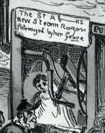 Барбершоп, надпись: „St A-ns New Steam Razor Patronized by her Grace”