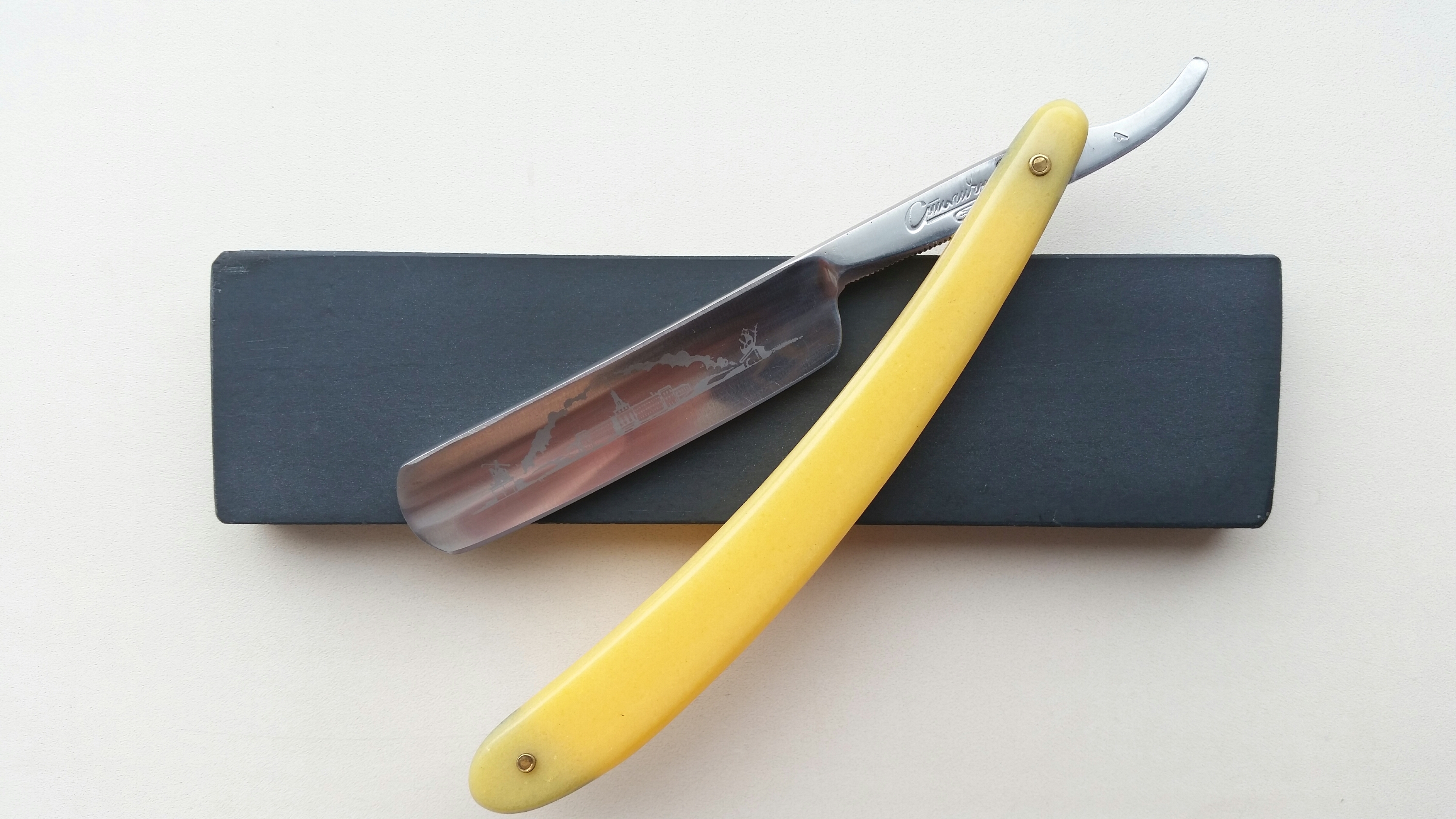 Продается от skvaterПРОДАНО 193) Сланец для доводки опасных бритв из СССР ПРОДАНО Сланец родом из СССР, попал ко мне вместе с набором бритв, принадлежал парикмахеру при Союзе. Удачный бритвенный размер 165х41х12 мм. Выровнен и доведен до F800 с обоих сторон. Предположу, что это Сыростанский (Атлянский) сланец. Бритва не продается. Цена - руб. Spoiler Show