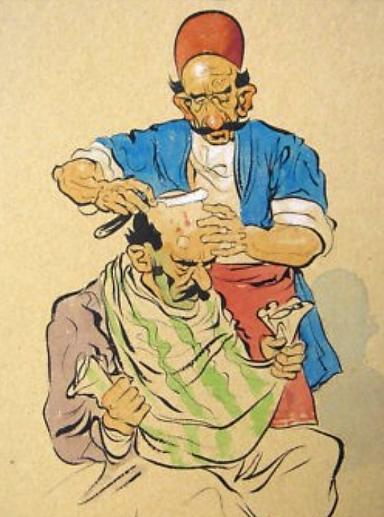 Он побывал в Испании, Марокко, Мальте, Египте, Синае, Малой Азии и Константинополе. „Shaving small boys in cairo, Egypt”, „Бритье маленьких мальчиков в Каире, Египет”, 1879 г. Бритье: Правка на колодочном ремне: Внизу целая куча бритв: