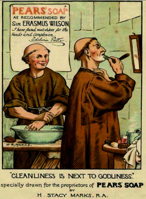 Вот еще один случай, когда удалось найти автора рекламного рисунка, ориентированном на продвижение косметического продукта для бритья опасной бритвой. Он снова рекламирует мыла для бритья „Pears”. Henry Stacy Marks (1829- 1898). Генри Стейси Маркс был британским художником. „Cleanliness is next to godliness” „Чистота - залог здоровья” (Внизу под заголовком написано „specially drawn for the proprietors of Pears soap” - „специально нарисовано для пользователей мыла Pears”) Взглянем поближе: С 2013 г. с кайфом бреюсь опасной бритвой пять раз в неделю, в три прохода.