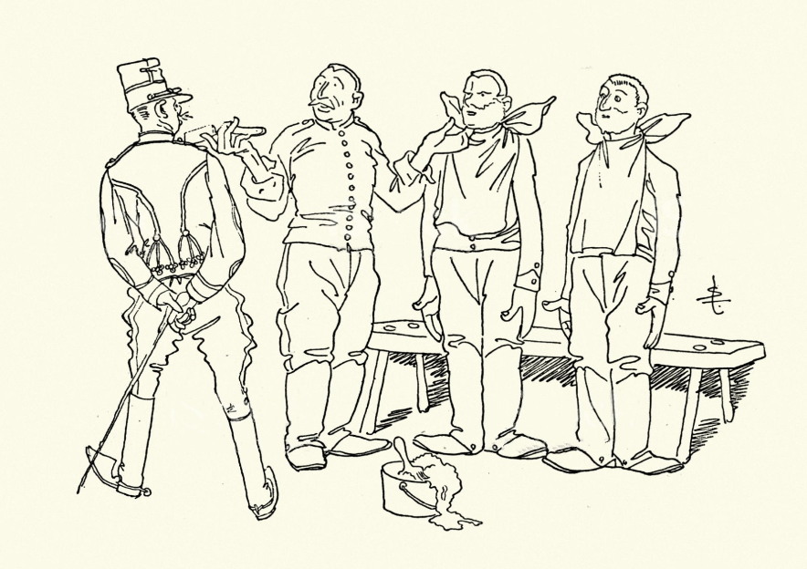 Вот его иллюстрация из книги Жоржа Куртелина (Georges Courteline, 1858-1929) „Le train de 8h 47 (Поезд в 8:47)” „Scеnes de la vie de caserne” „Сцены из казарменной жизни” Взглянем поближе: