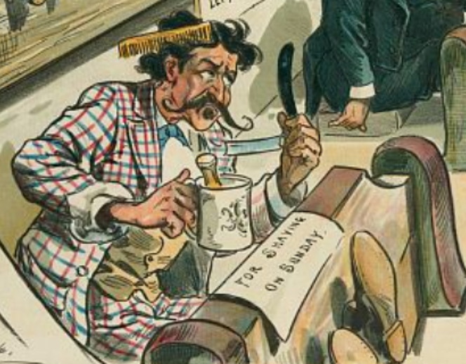 „In the interest of labor and morality” „В интересах труда и нравственности”, 1895 г. Карикатура показывает слева многих бизнесменов и женщин в колодках и позорных столбах за такие „правонарушения”, как подача гостям вина в воскресенье, за бритье в воскресенье, за продажу стакана пива в воскресенье, за чистку обуви в воскресенье и т. д. Взглянем поближе: