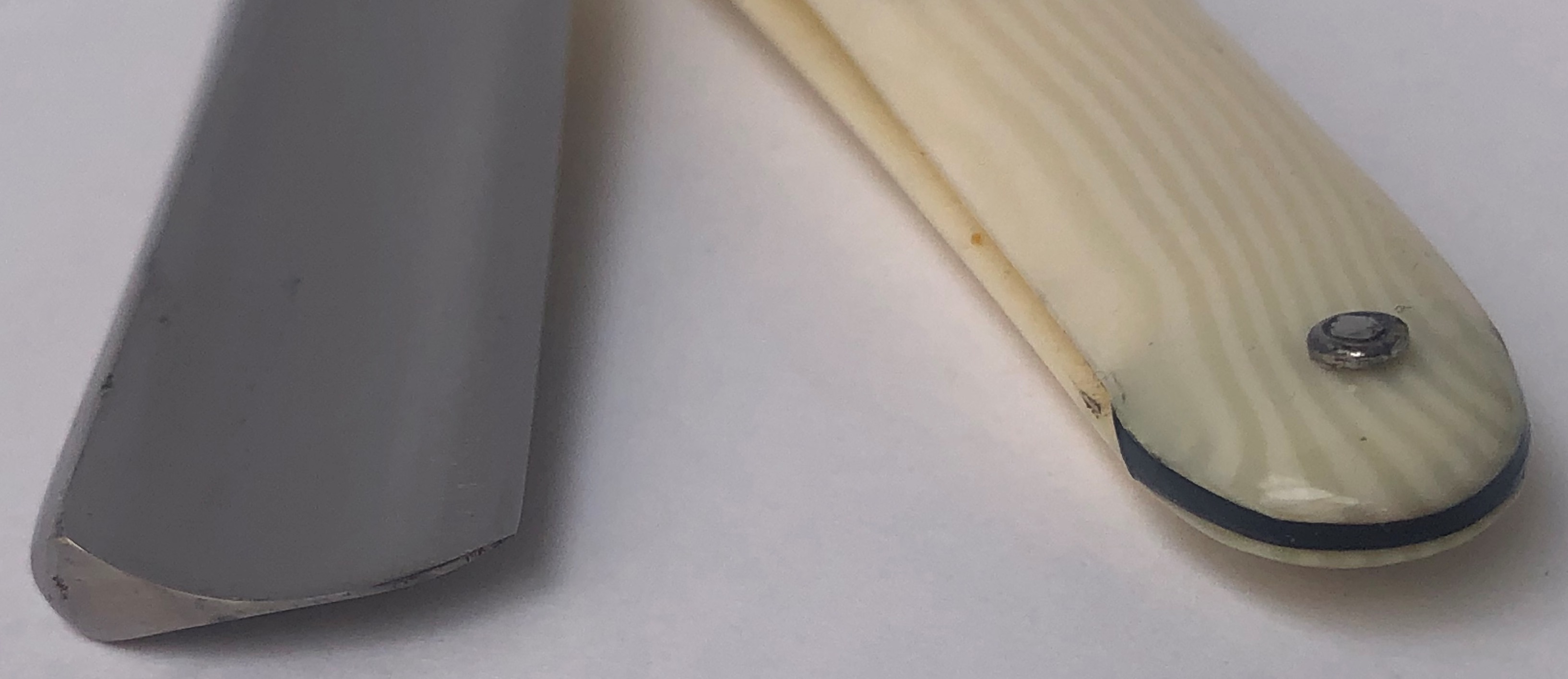 Бритва без следов пользования. Бритва была разобрана, немного освежено полотно от патины и снова собрано, с сохранением оригинальных пинов.Идеальная геометрия клинка:кромочка равномерна по всей длине.Сталь и кромка чистые от видимых дефектов.Бритва тяжёлая, мощная.Состояние новой.