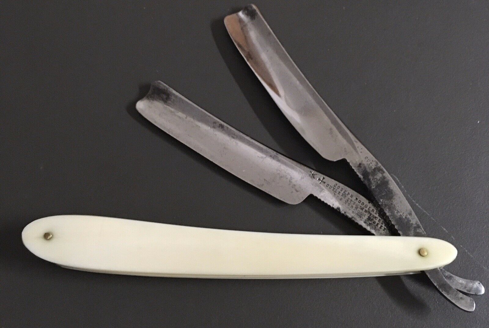 сладкая парочка... одна до 1890 года, вторая после. родное зеркало, есть немного следы от небрежного хранения, но без надобности что-то драть наждаками, приятные такие и свежие экземплярчики. и футляр на два Роджерса, но, наверняка, с другой модельки. эти бритвы маленькие для него :)