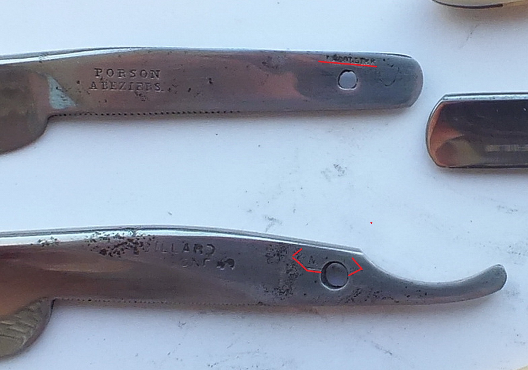 Помогите определить бритвуне установить. Ну, понятно, что Тьер, больше негде, а кто там конкретно - неизвестно. форма, четкое клеймо, много лишней информации в клейме Помогите определить бритвуи потом ножики , вон, нашлись. На них написано - "нержавеющая сталь" и клеймо того же магазина. а это 20-30е годы (нержавейки, как стали, до того не было)