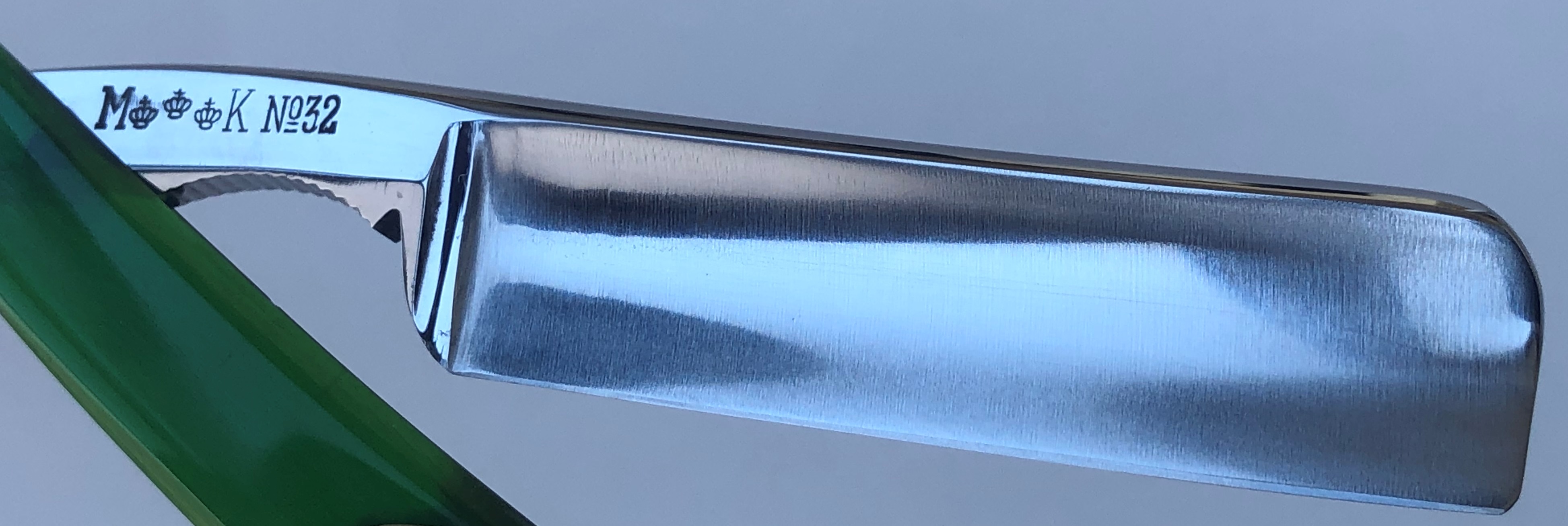 Бритва прибыла из Японии, но на японку совершенно не похожа. По всей видимости все таки немецкая.Лицевая сторона оригинальная, тут ничего не делал. Обратную сторону немного освежил от царапин и патины. Осевой перебрал , добавил внутренние шайбы и заново установил родной пин.Эффектный ажурный обушок,редко когда представленный на опасных бритвах. Идеальная геометрия полотна:кромочка равномерна по всей длине.Тяжёлая, с неплохой сталью и во целом красивая бритва. Будет заточена и подготовлена к бритью.