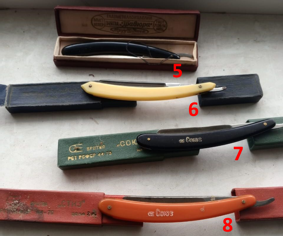 Так как последние 3 года я вообще не следил за ценами на рынке, прошу корректировать ценники, если я некорректен в ценообразовании. Фото делал родственник, далёкий от темы бритья клинковой бритвой. Поэтому всем бритвам присвоил номера и краткое описание из того, что помню сам. При наличии интереса к покупке - попрошу человека открыть бритву и сделать подробные фото со всех сторон.