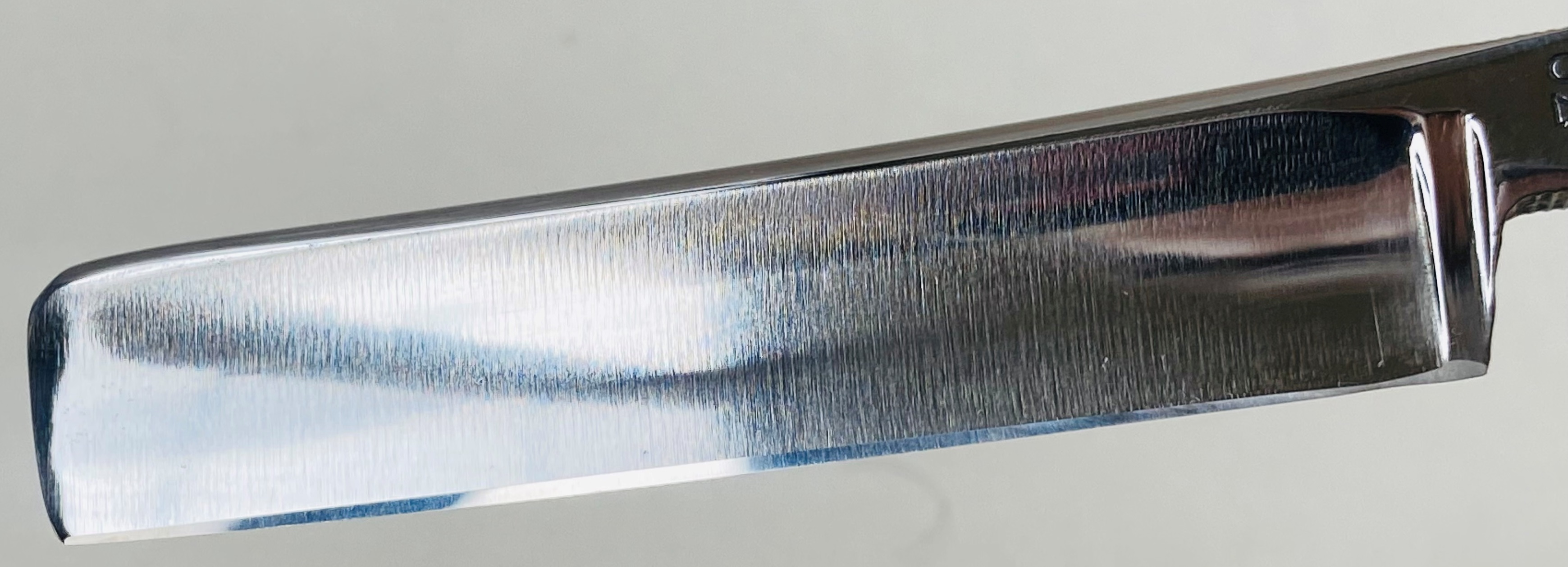 Бритва находится в идеальном состоянии и никогда в пользовании не была. Остатки масла с консервации удалены.Можно заметить шикарную, чуть уловимую патину на обратной стороне клинка,которую просто рука не поднялась удалять.Также видны следы от заводской электро-химической заточки. Идеальная геометрия клинка:кромочка равномерна по всей длине и еле заметна.Оригинальная шлифовка и полировка полотна.Травление чёткое, без потертостей.