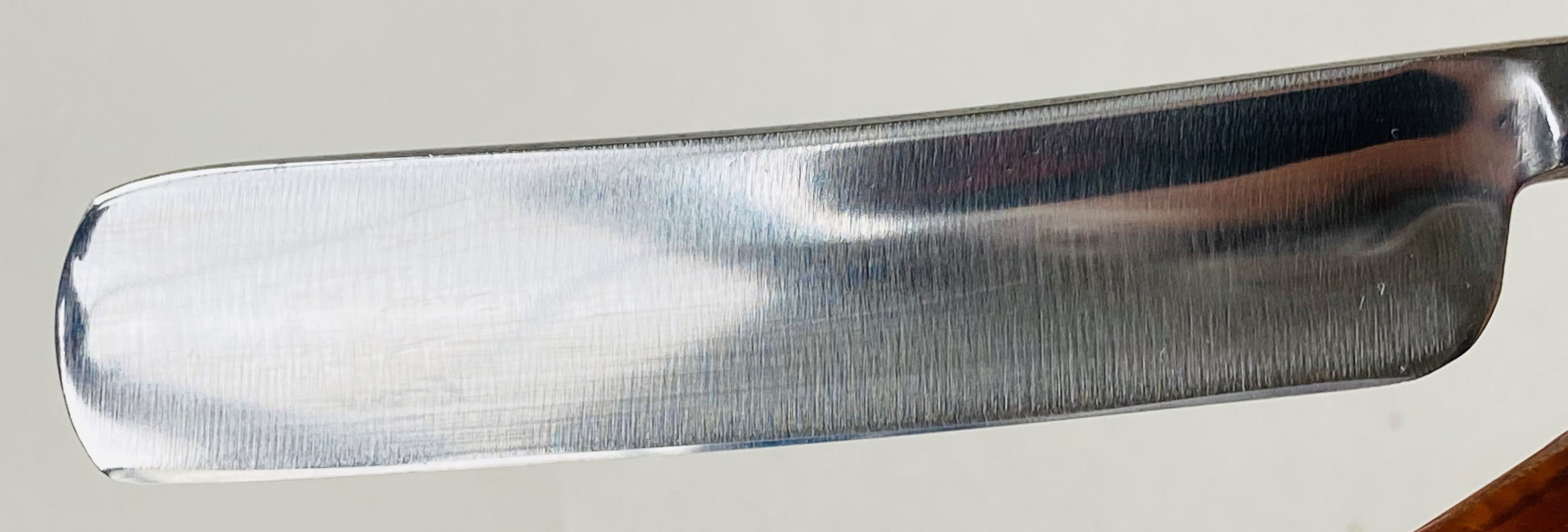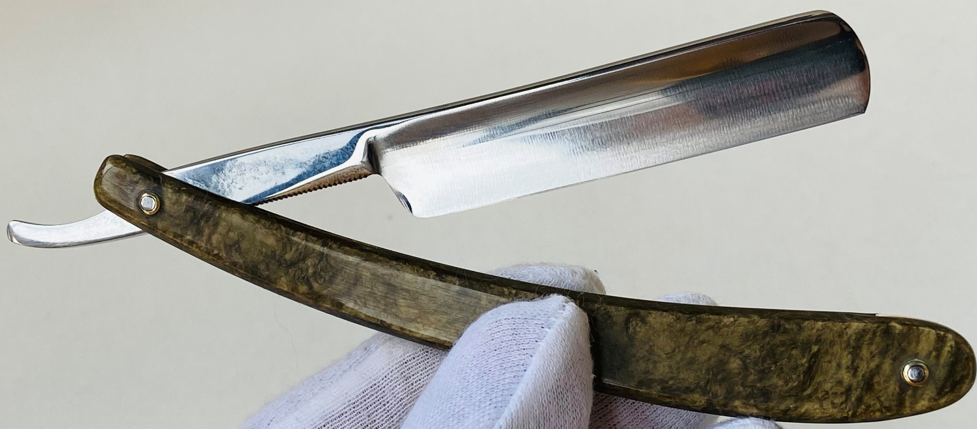 Бритва без активных следов пользовании и находится в прекрасном состоянии для своих преклонных лет.Для порядка перебрал бритву, заменив внутренние шайбы,но заново поставив оригинальные пины на место.Умеренная шлифовка и полировка полотна.Кромочка равномерна по всей длине.Тяжёлая и мощная бритва.Оправа ровная,в идеале.Заточена и готова к бритью.