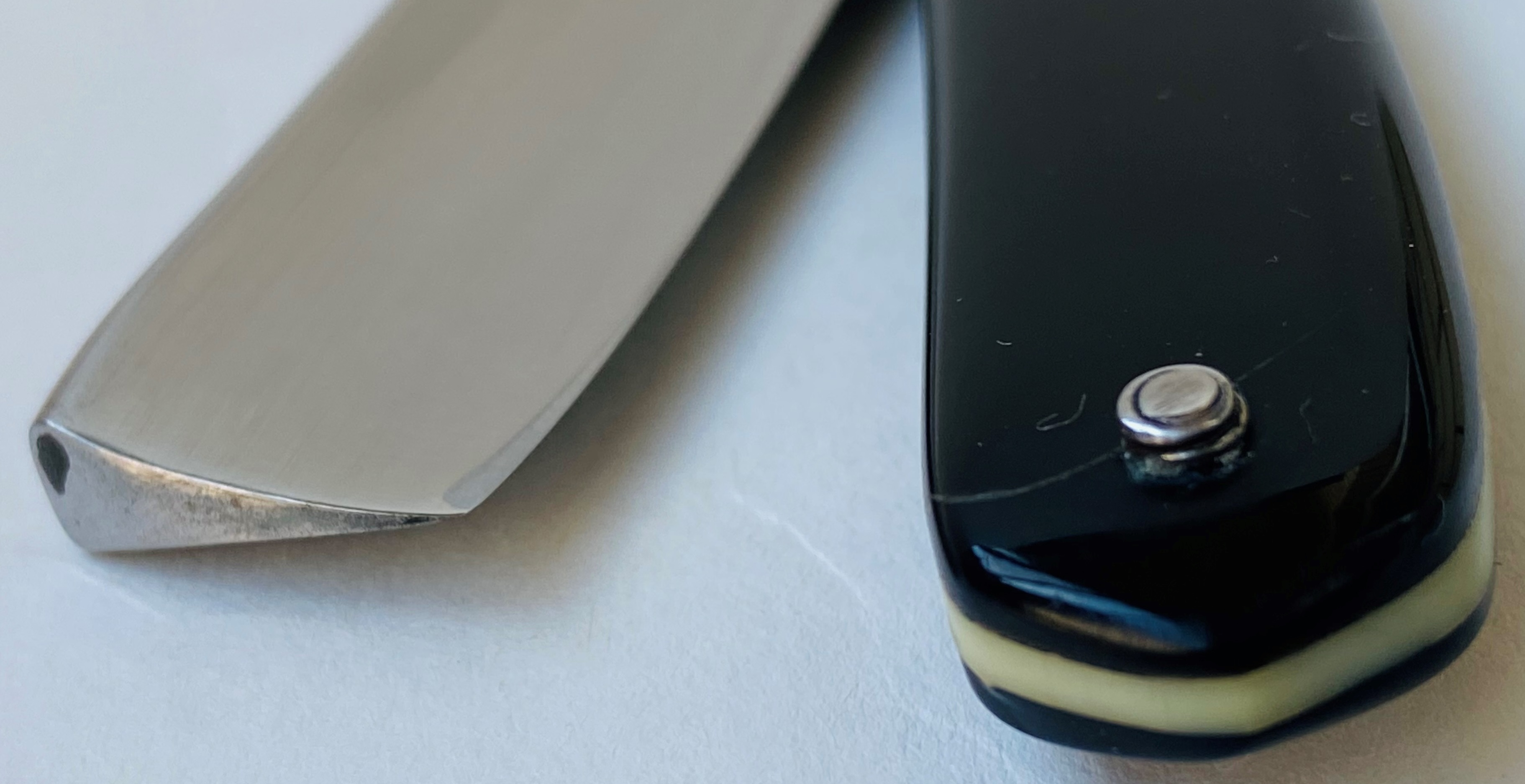Бритва хоть и пользованная,но находится в очень хорошем состоянии для своих лет. По всей видимости была в пользовании у барбера,так как немного задран носик.Была разобрана, для приведения клинка в порядок.Шлифовка и умеренная полировка. Кромочка равномерна по всей длине.Оригинальные пины были перебраны и заново поставлены. Родная оправа ровная и мощная.( Небольшая трещинка в районе нижнего пина была надёжно проклеена с обеих сторон,отшлифована и отполирована.Так что практически незаметно и ни на что не влияет).