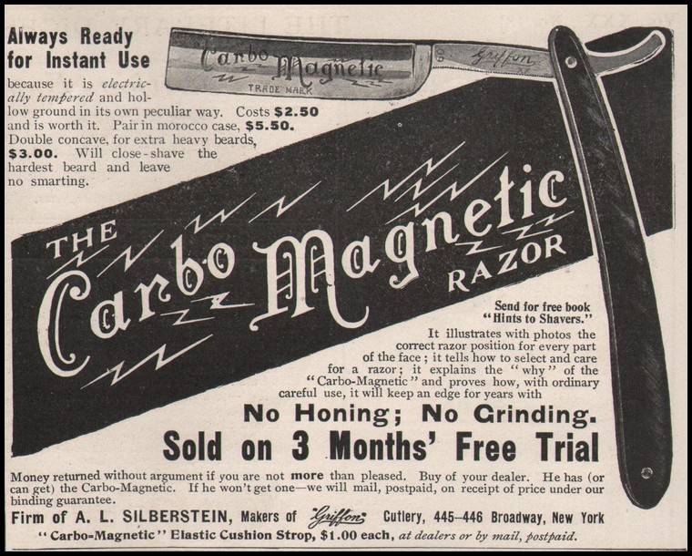 ИМХО: "Электрик" и "Магнетик" суть одно, в отношении бритв. В тот период была особо популярна тема электричества (и как мы сейчас видим - не зря), появилась технология нагрева железа с помощью электроиндукции, чем и воспользовались производители бритв, нагревая таким образом заготовки для дальнейшей термообработки, производители заявляли, что таким образом нагрев происходит равномерно и контролируемо, в отличии от стандартного метода разогрева на углях. Поэтому и писали на таких бритвах "Магнетик" (т.к. нагрев происходил с помощью магнитов) и "Электрик" (без электричества тоже не обходилось). А к свойству железа притягивать себе подобное, надписи эти не имеют отношения, и в те времена любой дурак подержав бритву у постоянного магнита, мог получить намагниченную бритву.
