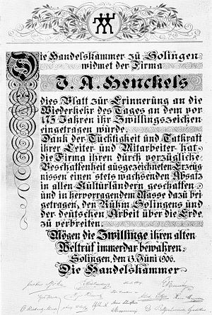 Торговое имя Henckels было зарегистрировано Торговой палатой 5 декабря 1882 года. Фирма стала поставщиком Прусской Королевской и Австрийской Императорской семей, и открыла выставочный зал в Берлине на Jagerstrasse 50, который позже переместился во впечатляющие владения на Leipzigersrtasse 117-118. К 1900 году фирма принадлежала Fritz W Beckmann (Фритц В Бекманн) и Alfred Wolters (Альфред Вольтерс). В 1883 году в Нью-Йорке открылся американский выставочный зал, а импорт ножей Henckels был возложен на фирму Graef & Schmidt (Грэф и Шмидт) [которая в 1943 году была куплена фирмой Revlon (Ревлон) из США]. Также, в 1913 - 1914 годах Henkels производила первые ножи Ellery Hunter (Эллери Хантер) для фирмы из Сан-Франциско Ellery Hunter Co.