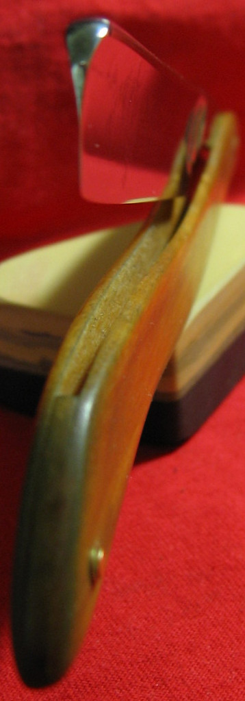 Длина лезвия: 72 мм Ширина лезвия: 16 мм Толщина лезвия (спинка): 4 мм. Бритва и ручка без трещин сколов и иных дефектов, на левой стороне полотна у головки следы от коррозии. Закрывается ровно и плотно. Очень красивая ручка из дерева - липа, пропитанное натуральным льняным маслом, без сиккатива и без какой либо химии, без краски, морилки, лака, только дерево и льняное масло. Такая ручка не боится воды. Пробное бритье мне очень понравилось. Мягко, нежно ласкает кожу, лезвие гибкое, повторяет контуры лица, как это не странно звучит, и при этом чисто выбривает. Состояние бритвы: 8-8,5/10 ИМХО комфорт и качество бритья - 9-9,5/10
