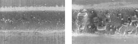 Увеличение ×1400. Слева 440A (близкая по составу к сталям, применяющимся для нержавеющих Бритв и лезвий), справа - 440С.