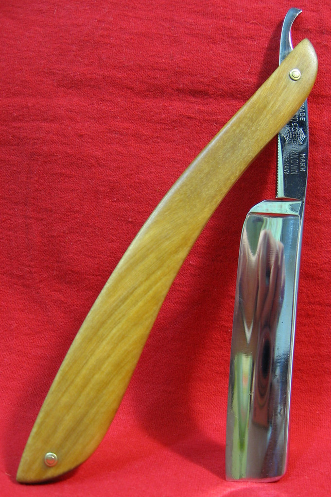 Spoiler Show Все фото (кликабельны) Show Описание Show Германия, примерно 1885-1926 гг. Бритва и ручка без сколов, трещин. Головные заклепки немного утопают в сторону и заходят чуть под дерево - это чисто визуальный дефект. Ручка дерево - липа, закрывается плотно, немного в сторону, но в ручку лезвие входит без проблем, не выпадает. Ручка с шайбами. Ручка пропитана 100% натуральным льняным маслом, без добавления химии, сиккатива, без морилки, краски, лака, только дерево и натуральное льняное масло. Такая ручка не боится воды. Состояние бритвы: 9/10 ИМХО комфортность и качество бритья: 7/10 (лезвие очень жесткое, звенит! Достаточно острая! Но лично для меня слишком жесткое лезвие) Видео Show