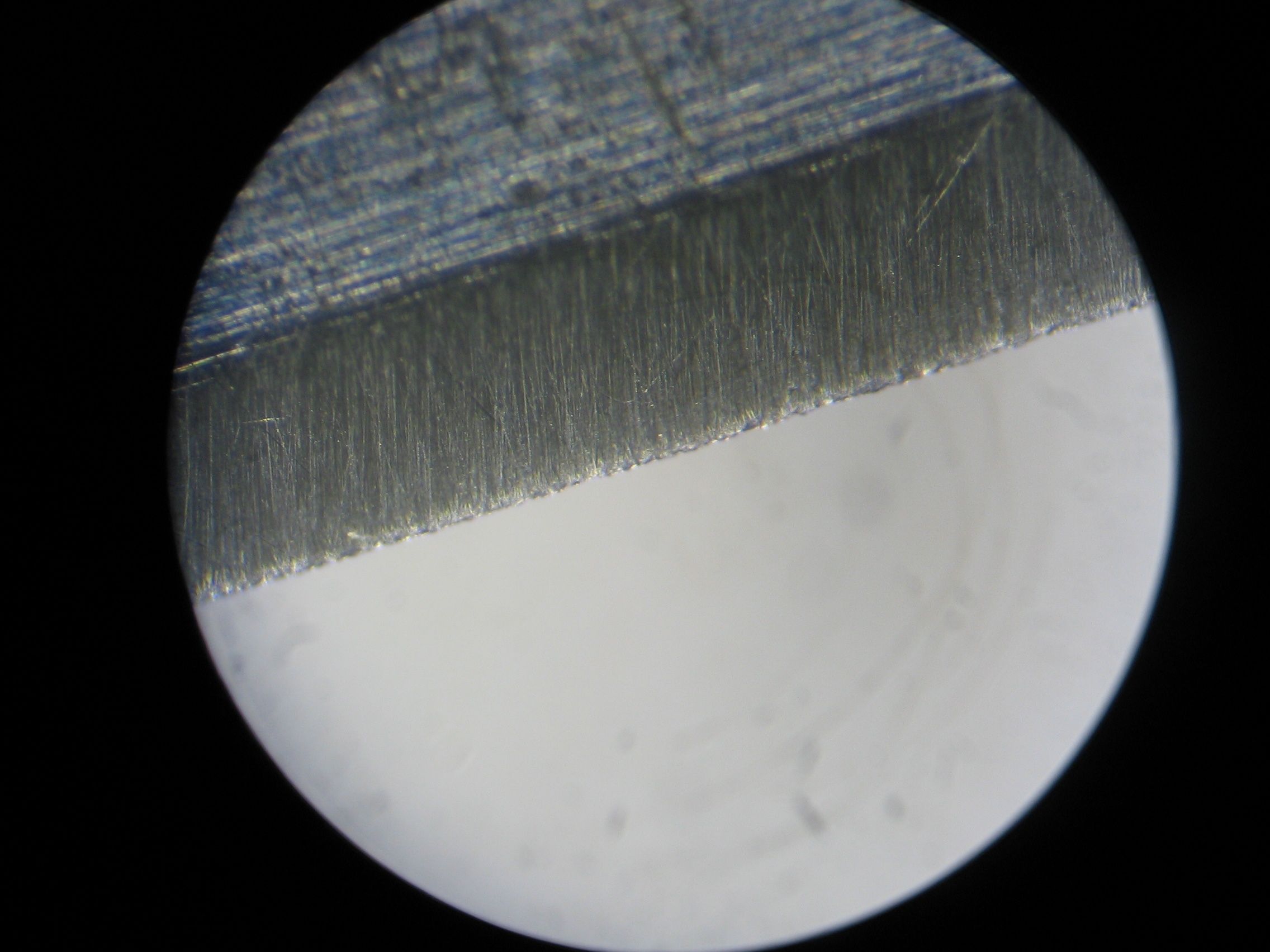 Re: Режущая кромка под микроскопомПроизвел отпуск кромки до темносоломенного цвета, 30 мин. в духовке. Заточил кромку , затем на керамогранит нанес алмазную патсу АСМ 1/о НОМ и довел до полировки. 3 маха на ГОИ (косые царапины)и + 5 махов на коже (почти без линзы)