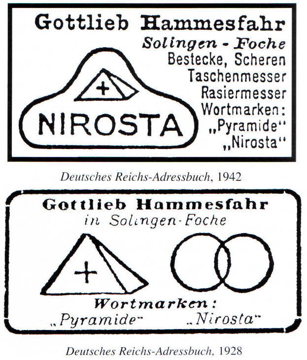 Gottlieb Hammesfahr & Co. AG, Nirosta-Werk, Solingen-Foche, находилась с 1939-го по 1970г.г. на Focher Strasse, 60. Брэнды: Pyramide (1904 №74263), Gottlieb Hammesfahr, Foche(1904 №72298), Gottlieb Hammesfahr, Solingen-Foche (1904 также №72298), пирамиды (1904 №77789), Nirosta, No Rusteel. Торговые марки: два кольца (1897 №27547), пирамида с крестом (1898 №30394), крест над двумя кольцами (1899 №31456). RZM код: M7/67. Код военного времени: cvp выделенный в марте 1941. Дата официального основания фабрики 1804 год (прим. Олег Бритва, как я понял, что они считают 1684 год началом ковки и вообще работ). Дата регистрации в Торговой Палате 12-го октября 1875 года. Эта фирма является одним из крупнейших производителей столовых приборов в истории города Золинген. Gottlieb Hammesfahr с конца 17 века (т.е. с 1684 года, прим. Олег Бритва) держали марку, т.е. неизменно занимались ковкой. Фирма специализировалась на ковке (Gesenkschmiede] в дополнение к изготовлению ножей и инструментов. В 1942 они делали столовые приборы, ножницы, карманные ножи и бритвами с брэндами Pyramide и Nirosta. S 98/05 штыки (сорри не знаю что это, прим. Олег Бритва) производились в течение 1915-18г.г., хотя большинство из них, делались в сотрудничестве с другими фирмами. Hammesfahr, как правило, поставлял заготовки. Самые ранние образцы 1915 были с товарным знаком с названием фирмы на кривой, и большинство из них были со знаком Erfurt Arsenal. Позже штыки с пирамидами были штамповались с тремя товарными марками Diirkopp-Werke AG в Билефельд, L 0 Dietrich в Альтенбург и Schubert & Salzer в Хемниц (GB/I/75). S 84/98 штыки производились в 1915-17г.г., а также многие из них носили клеймо Bayard и товарный знак Anciens Etablissements Pieper в Льеже и считается, что бельгийская фирма снабжала заготовками Hammesfahr (GB/II/180) . Боевые ножи для сражений в лесу (думаю правильно наступательный боевой нож, прим Олег Бритва) (Nahkampmesser) также изготавливались в этот период и также были с тремя товарными марками (DK/35, GFK/14). В течение Третьего рейха, как для SA так и для SS производились изделия с знаками SA и SS над овальной торговой маркой, а более на поздних версиях вместо фирмы стоял RZM номер (LD / 8, WMO/32/506, WW189/753). В 1939 г. компания принадлежала Ernst Gottlieb Hammesfahr. В августе 1971 г. компания была приобретена Wilkens Bremer Silberwaren AG (qv) (инфа, офф.сайт), немного позднее оригинальное здание фабрики было снесено. Фамилию Hammesfahr носили ещё и другие фирмы, например: ۞ Karl Hammesfahr, Fabrikation feiner Stahlwaren, Solingen-Foche, находилась на Bergstrasse, 9 в 1922 году. Маленькая фирма, специализировавшаяся на производстве столовых приборов, бытовых ножей и ножниц. ۞ Otto Hammesfahr, Besteckfabrik, Solingen-Ohligs, находилась на Schulstrasse, 22 в 1935 году, на Renpatt, 22 в 1939 году. Основана в 1888 как производитель столовых приборов, складных ножей и ножниц. ۞ Hammesfahr & Cie., формально Gustav Hammesfahr, Messer und Scheren-Fabrik, Solingen, находилась на Donaustrasse, 35 в 1939 году. О совместном использовании ТМ NIROSTA с фирмой Krefelder Stahlwerke AG так ничего и не узнал, думаю это надо звонить и спрашивать, я не в силах накопать инфу... Ремонт опасных бритв, звонить с 11-00 до 23-00, +79267729357, (whats app, telegram, VK), спросить Олега.