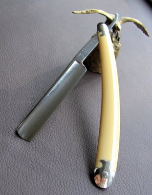 Параметры: ширина полотна 14 мм, обух 4 мм. Примечание: ручка из целлулоида, одна сторона немного искривлена ( от времени или температурного воздействия), ручка закрывается плотно (заменен осевой пин), полотно имеет легкие следы времени, бритва полностью вычищена, продезинфицирована , наточена. Цена 20 евро. L.V. Show