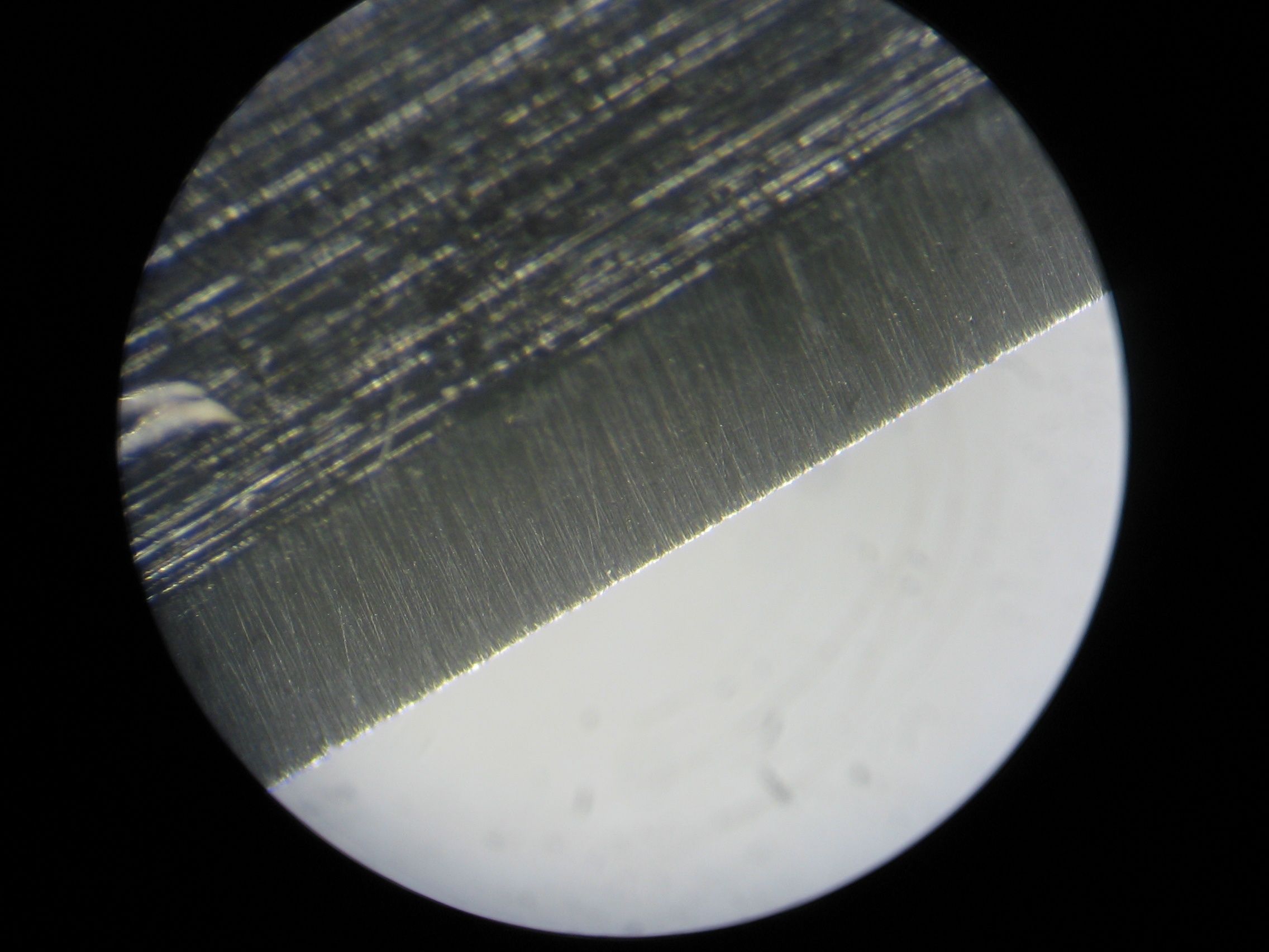 Re: Режущая кромка под микроскопомПроизвел отпуск кромки до темносоломенного цвета, 30 мин. в духовке. Заточил кромку , затем на керамогранит нанес алмазную патсу АСМ 1/о НОМ и довел до полировки. 3 маха на ГОИ (косые царапины)и + 5 махов на коже (почти без линзы)
