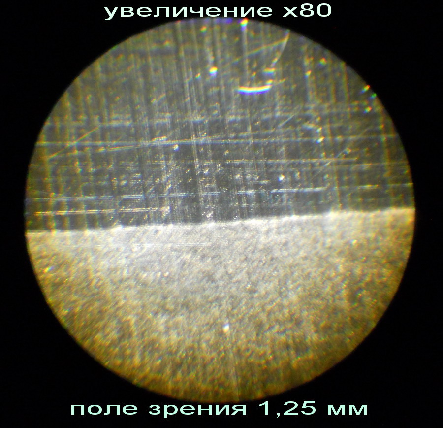 Вот фото границы на моей ЗТВ. Видна кристаллическая структура стали в виде матовой поверхности (внизу) и полированная поверхность (более темная вверху) ФОТО Show 32 года активно мусолю харю клинковой бритвой