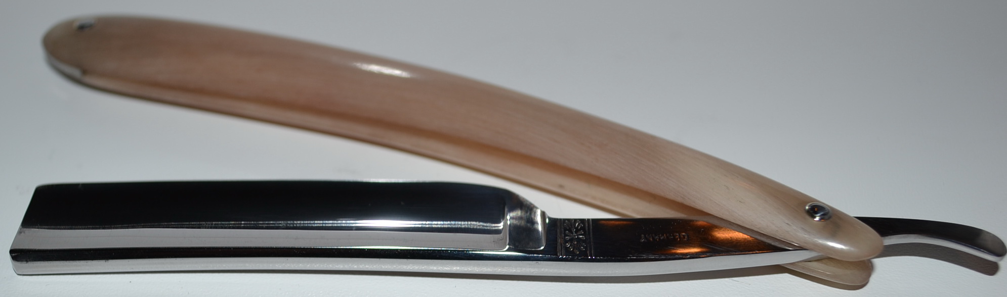 Цельный рог горного барана, тонирован, полирован.Клинышек как всегда, олово. Бритва H.Boker&Co №2666 Выпущена в годы правления Рузвельта.