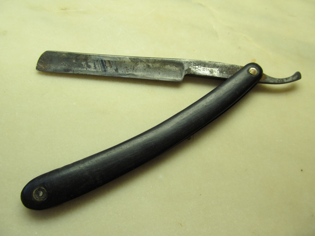 Прокладкой между частями ручки служит свинцовый металл. К сожалению, такие перламутровые ручки довольно хрупки. Большая удача для современного коллекционера – найти образец этой красивейшей ручки без трещин и сколов. Мне повезло найти две такие бритвы, но обе были со сломанными ручками. Было отмечено, что ручки были разных размеров под разную ширину бритв.