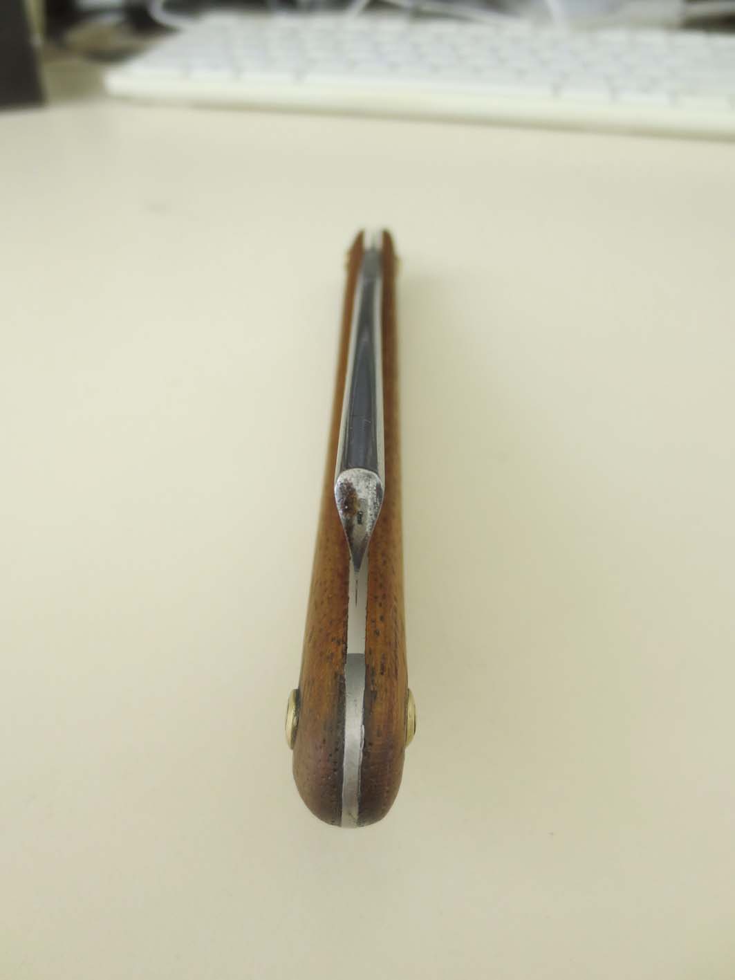 Re: как новичок тренируется (издевается) над старой опаснойТакой цвет можно получить просто отпескоструив полотно электрокорундом 40-50мкм. Кстати, на экземплярах, которые не особо жалко (просто привести в божеский вид и дать возможность бриться) частенько применяю лабораторный пескоструй электрокорундом 50мкм для очистки поверхности. Потом, ессно, шлифовка. Хотя если не шлифовать - получается этакий цвет "матт грей" и заточенная кромка отлично смотрится. Но вот с точки зрения гигиены шлифовка в зеркало все-таки лучше )) Улыбайтесь! Re: как новичок тренируется (издевается) над старой опаснойРакеты в зеркало никто не полировал. Некогда было фигней заниматься, все были заняты важным делом- шли к коммунизьму семимильными шагами. Тяп-ляп и готово.