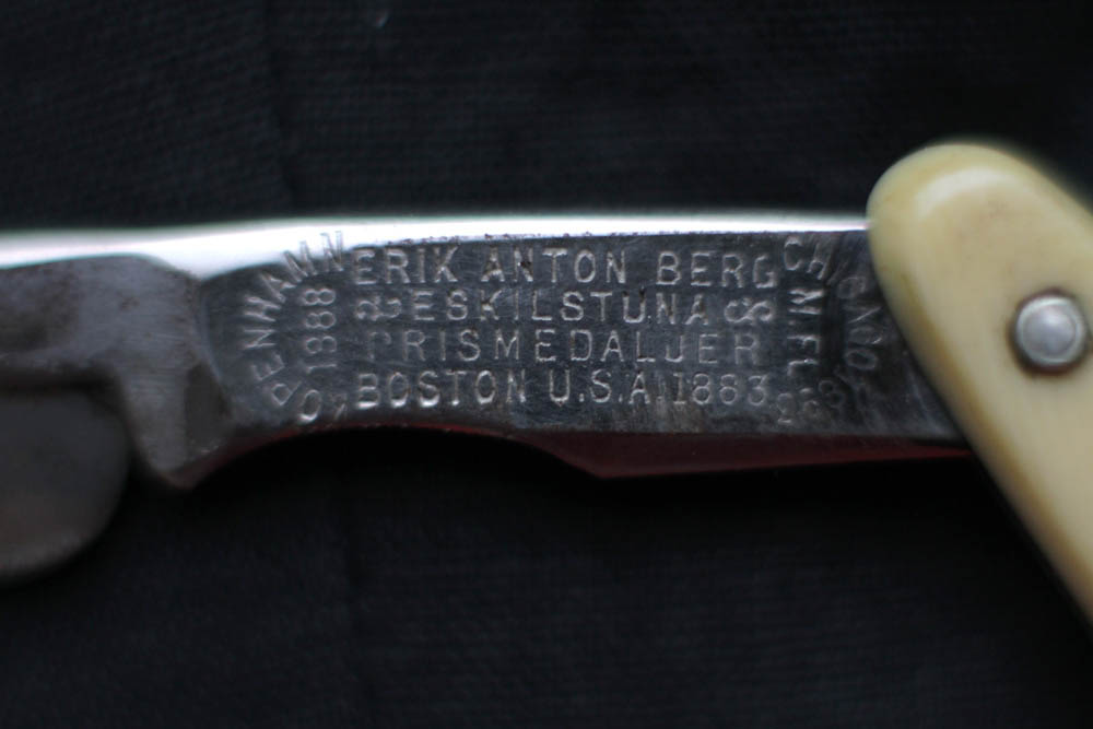 уралец: Что за производитель Erik Anton Berg? Предложили старую бритву от него,ручка ,похоже, неродная ,но само лезвие в очень хорошем состоянии, без всяких следов ржавчины, но и следов предпродажной подготовки нет, лезвие темное. На лезвии ряд (Штук восемь) золотых медалей и четкое клеймо рыбы,видимо акулы. Ширина лезвия ,скорее всего, 6(8 дюйма Может кто подсказать. что это зв бритвы, то в поиске не нашел?
