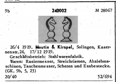 Moutin & Kirspel , Solingen in 1920, 1922 and 1925, Kasernenstrasse 24 in 1939. Brand names: 'Mundial', 'Sanitas', 'Tassa'. Open-blade razor and safety-razor maker.