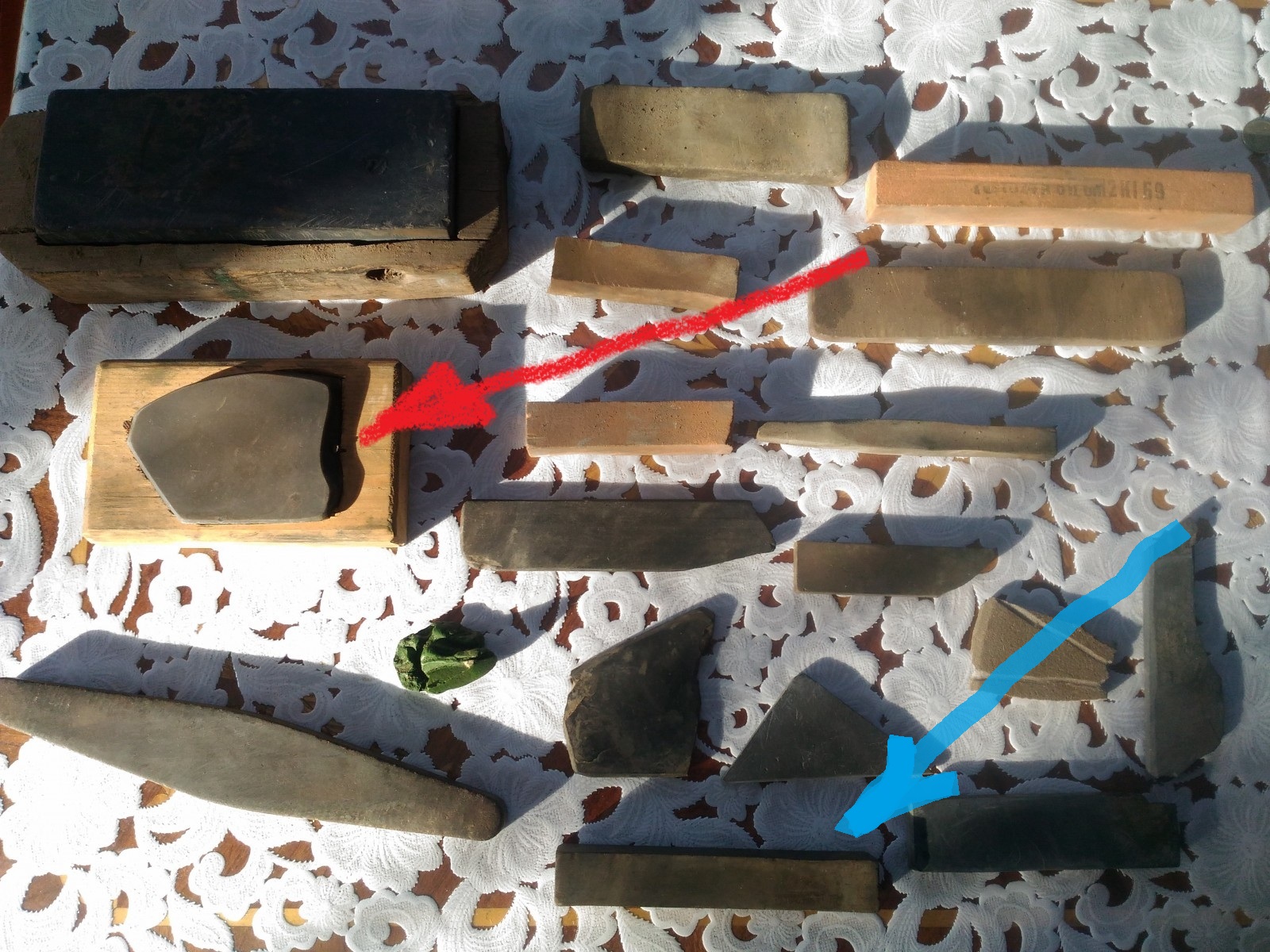 Помогите разобраться в камняхДоброго времени! С недавних пор заинтересовался бритьем опасной бритвой. Нашел старую дедову бритву, попробовал сбрить волосы на запястье - не бреет. Нашел в гараже целую кучу дедовских абразивных камней, но они никак не подписаны, какой в начале, какой в конце идет не понятно. Надо сказать, что дед всю жизнь был столером и таки знал толк в заточке стамесок и рубанков. Может кто по фото сможет определить и подскажет, как ими точить и в какй последовательности