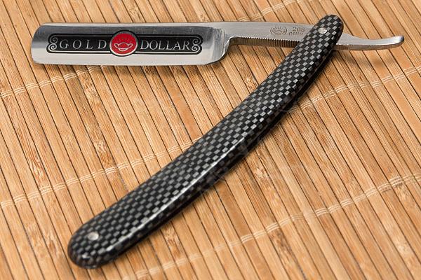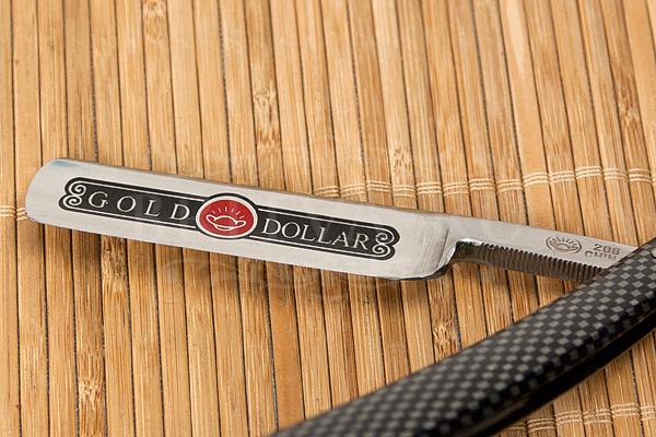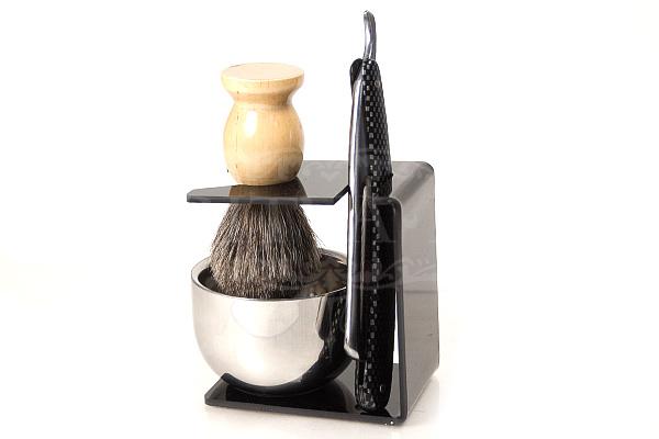В комплекте: опасная бритва GOLD DOLLAR (ширина 6/8", вогнутость 1/1 - полная, пластмассовая ручка с серо-чёрной шахматной раскраской под карбон), кисточка-помазок (щетина барсука, лакированная ручка из дерева), металлическая чашечка, пластмассовая подставка. Поставляется в картонной коробке.