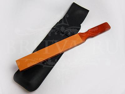 Узкий двусторонний ремень для правки опасных бритв. Натянутый на деревянную раму. Двусторонний: одна сторона гладкая, другая ворсистая. На деревянной раме ремня присутствует два продольных распила для придания упругости во время правки бритвы. Ремень поставляется в чехле из натуральной кожи черного цвета. На чехле предусмотрено отделение для опасной бритвы. Чехол надежно закрывается при помощи прижимающей кожаной полоски. Полные размеры = 352 х 17 х35 мм, длина кожаной полосы = 215 мм, масса = 122 г.