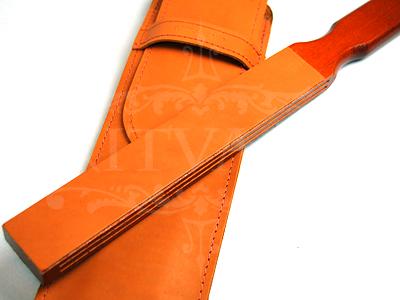 Узкий двусторонний ремень для правки опасных бритв. Натянутый на деревянную раму. Двусторонний: одна сторона гладкая, другая ворсистая. На деревянной раме ремня присутствует два продольных распила для придания упругости во время правки бритвы. Ремень поставляется в чехле из натуральной кожи светло-коричневого цвета. На чехле предусмотрено отделение для опасной бритвы. Чехол надежно закрывается при помощи прижимающей кожаной полоски. Полные размеры = 352 х 17 х35 мм, длина кожаной полосы = 215 мм, масса = 108 г.
