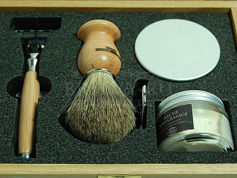 Высококачественный элитный бритвенный набор, адаптированный под бритвенную систему Gillette Mach3. В комплекте станок для бритья, кисточка-помазок для бритья из высококачественной щетины барсука (ручки из кедра), металлическая подставка, мыло для бритья 100 мл, бальзам после бритья 50 мл. В деревянной коробке.