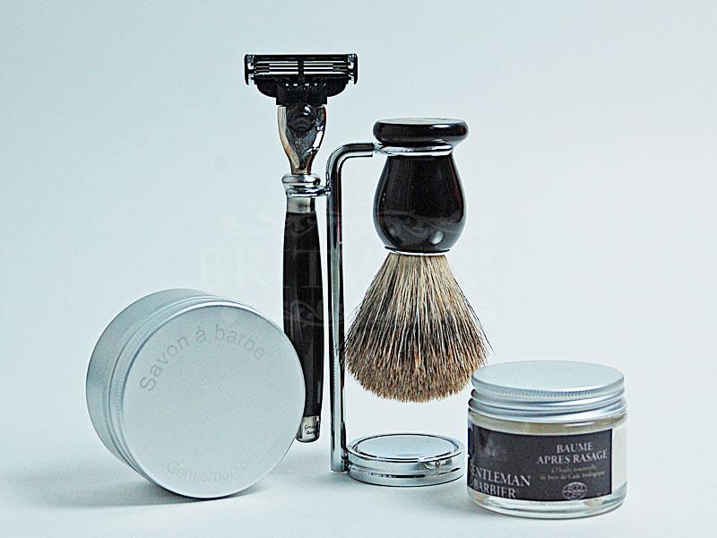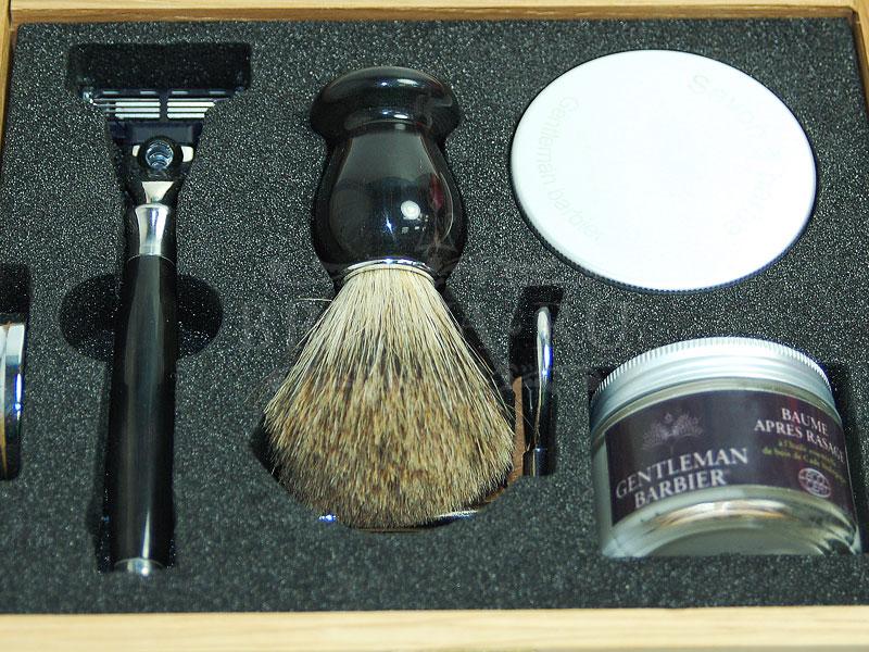 Высококачественный элитный бритвенный набор, адаптированный под бритвенную систему Gillette Mach3. В комплекте станок для бритья, кисточка-помазок для бритья из высококачественной щетины барсука (ручки из тёмного буйволиного рога), металлическая подставка, мыло для бритья 100 мл, бальзам после бритья 50 мл. В деревянной коробке.