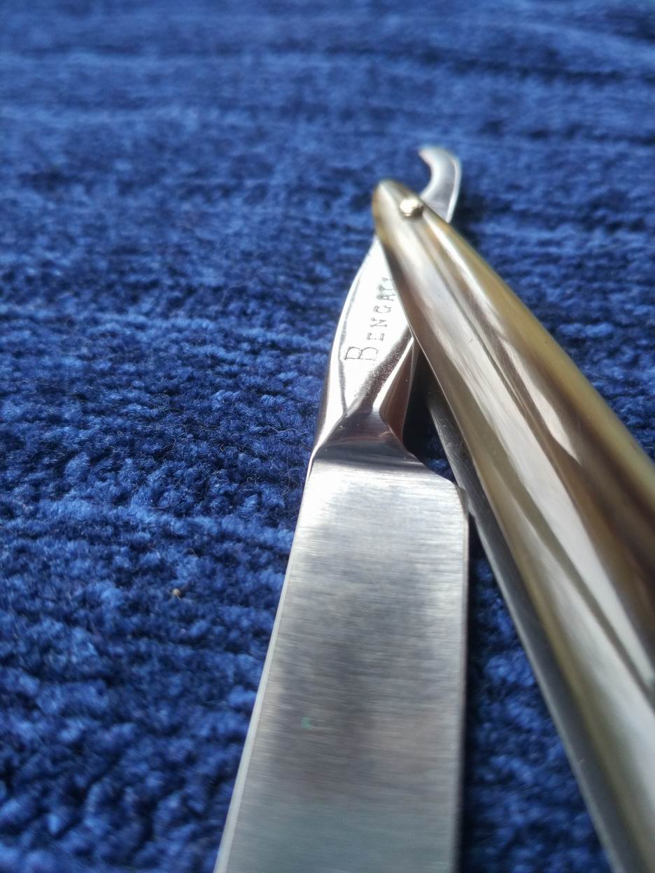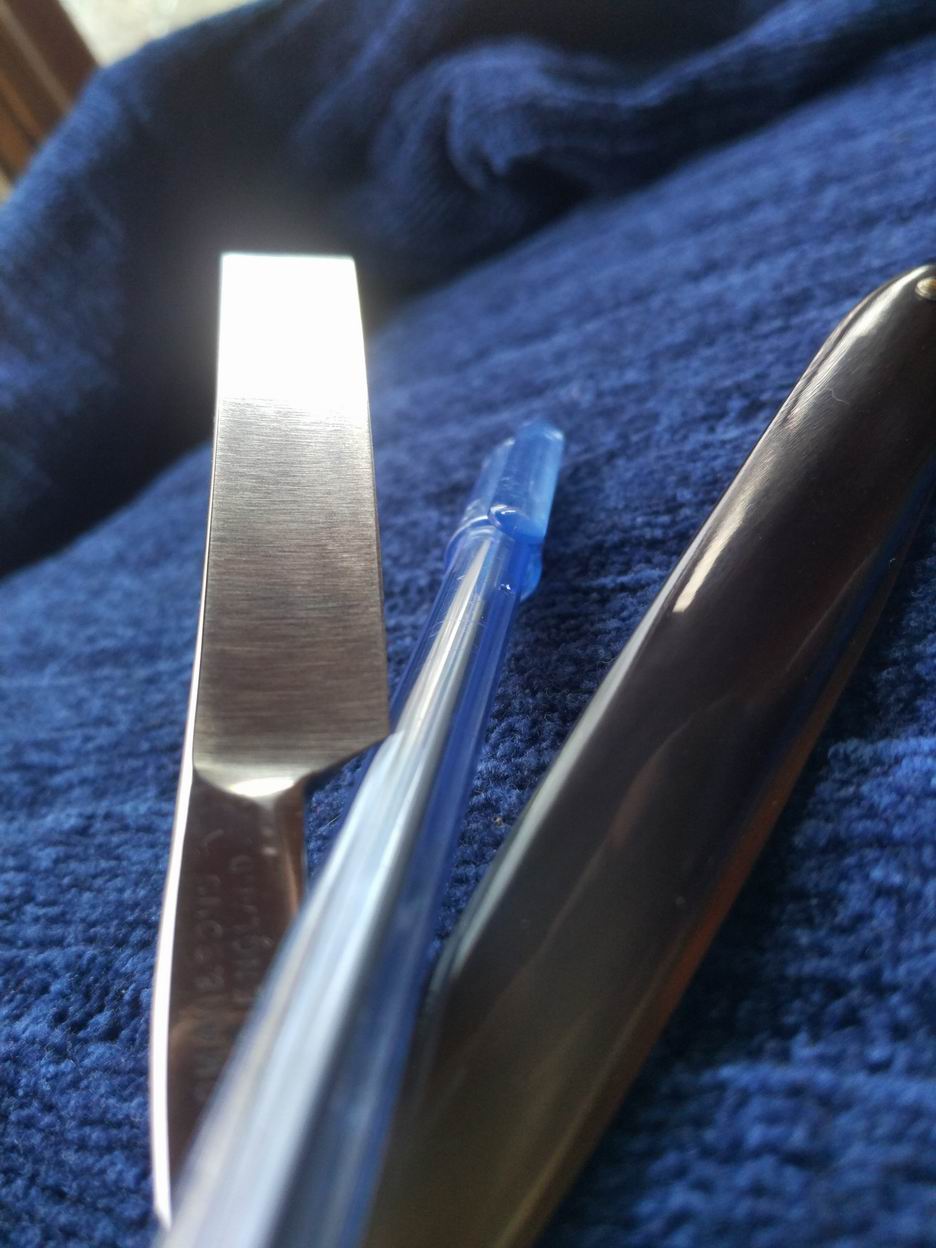 Re: Бритва до... и после...По причине больничного стало мне скучно , начал перебирать железяки и напал вот на такого дядю : Resize of DSC00125.JPG Resize of DSC00123.JPG Был жуткий скол по центру , я его убрал , режущая кромка стала неприлично широкой и некрасивой .+ вековая коррозия глубокая заставила меня отложить эту бритв...