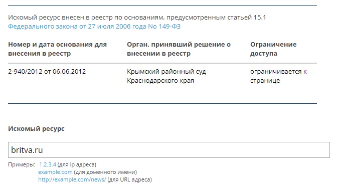№ 149-ФЗ «Об информации, информационных технологиях и защите информации» уведомляем, что на основании решения суда/уполномоченного федерального органа исполнительной власти (Крымский районный суд - Краснодарский край) от 06.06.2012 № 2-940/2012 указатель (указатели) страницы (страниц) сайта в сети "Интернет" viewtopic.php?p=80885&sid=173cb7c38c99a ... 234#p80885 включен(ы) в «Единый реестр доменных имен, указателей страниц сайтов в сети «Интернет» и сетевых адресов, позволяющих идентифицировать сайты в сети «Интернет», содержащие информацию, распространение которой в Российской Федерации запрещено», номер реестровой записи 875162-РИ в связи с тем, что данный указатель (указатели) страницы (страниц) сайта в сети "Интернет" содержит сведения, распространения которых в Российской Федерации запрещено решением суда.