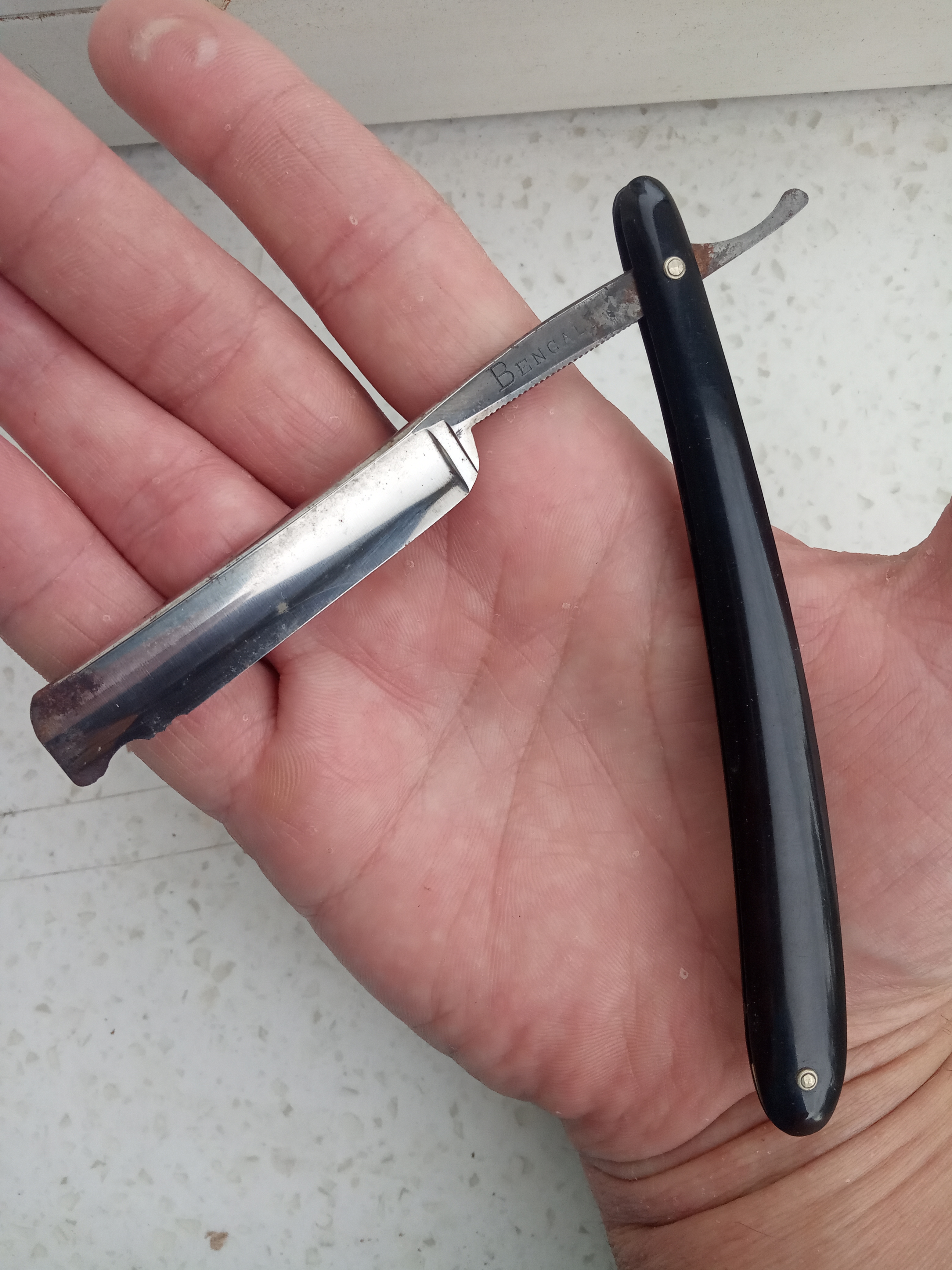 Поработал вчера с бритвой клиента. "Двухзаковная" 56 года была в достаточно плачевном состоянии, со следами грубой шкурки вдоль всего полотна, глубокими царапинами и кавернами по всему клинку. Разобрал, почистил, попробовал сохранить фирменную "ступеньку" на полотне и восстановить "заводской" гринд. Также, поставил родную осевую заклёпку, которую удалось сохранить. До Spoiler Show Spoiler Show Всё будет ХОРОШО...тел:+79065827134