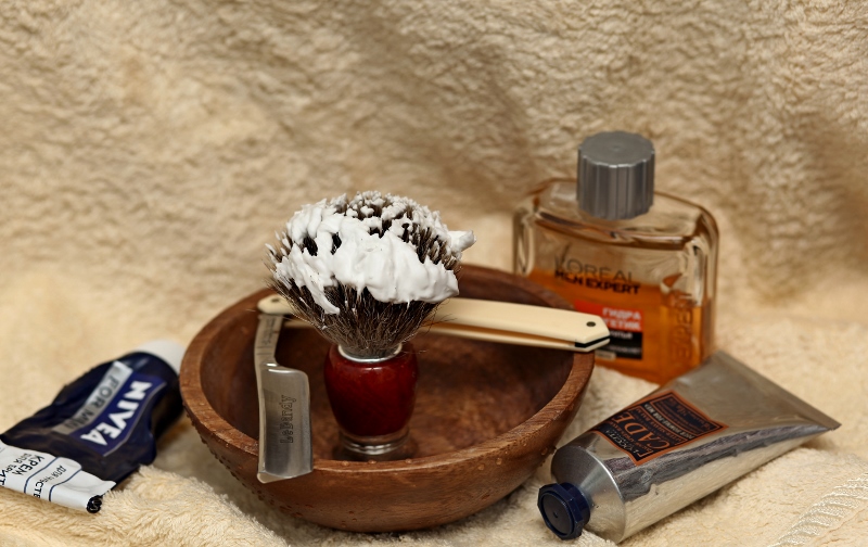Крем для бритья: Nivea для чувствительной кожи Бритва: Le Dandy, TI, 5/8 Помазок: Muehle Pinsel Чаша: деревянный салатник Premier Housewares После бритья: лосьон L'oreal Men Expert Гидра энергетик и минут через 20 - бальзам после бритья loccitane CADE (можжевельник) (пену на помазок нанес уже после бритья, из баллона, для антуражу так сказать, но, наверное, зря