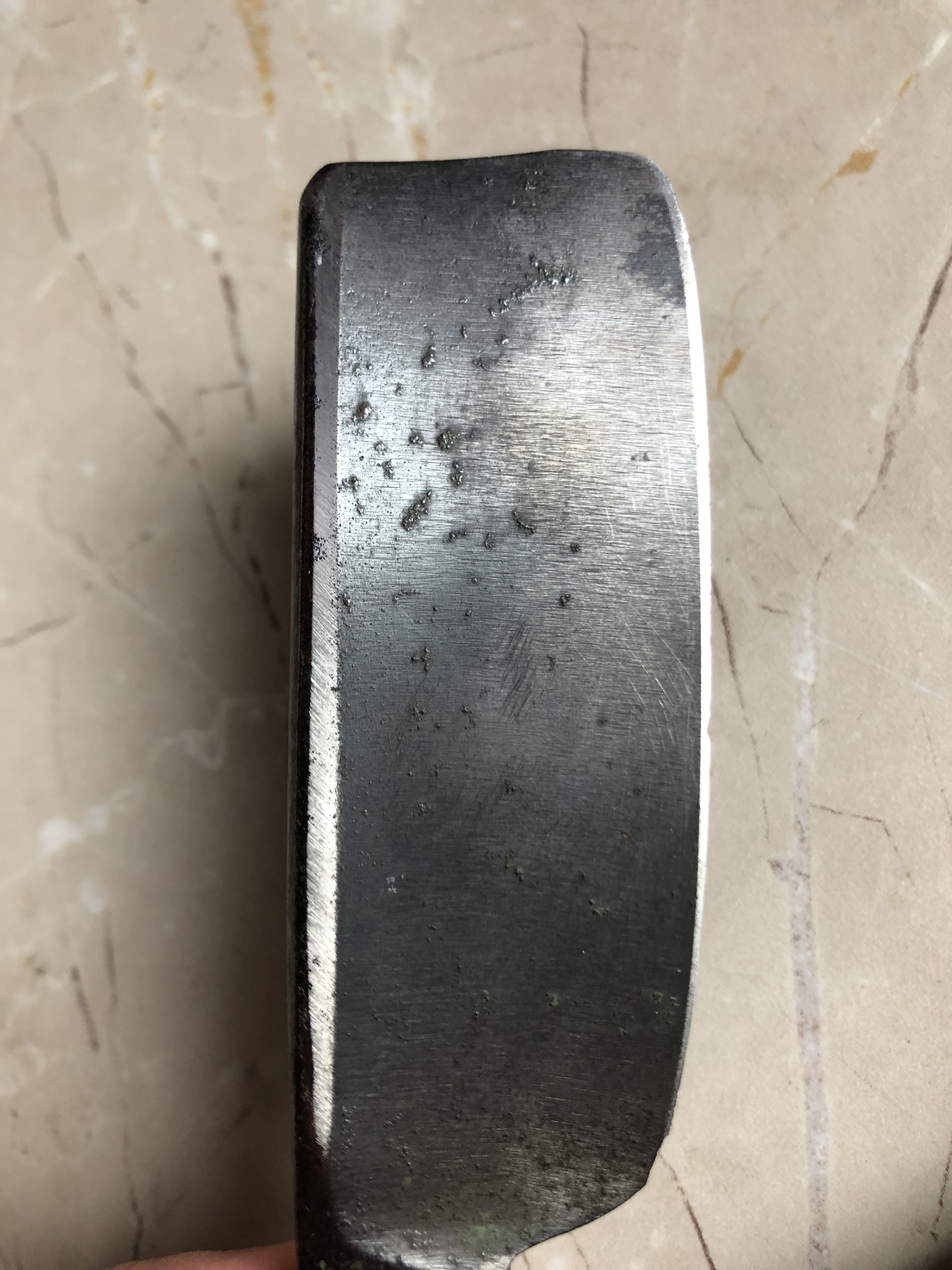 Бритва до... и после...Вот что вышло, ручку пришлось заменить: рог, клин олово шайбы родные. Полностью удалить каверны и раковины не удалось иначе пострадает геометрия и размер Бритвы. Да и в планах этого не было, чистка по минимуму.