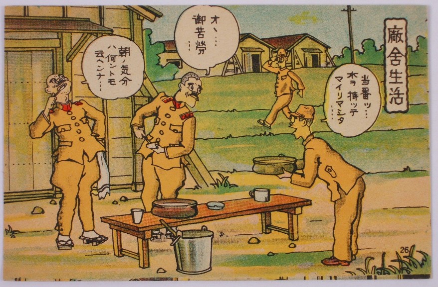 Но на первый взгляд там ничего героического, всё вполне банально. Заголовок по смыслу близок к нашему выражению: " Суровая школа жизни"..)) А в репликах обращение к офицерам по фамилиям, и типа " я вам горячей водички принёс"..)) Скорее не открытка , а карикатура на армейский быт.. К тому же они похоже не бреются, а зубы чистят Челябинские мужики настолько суровы, что правят бритву не на ремне, а на роже.