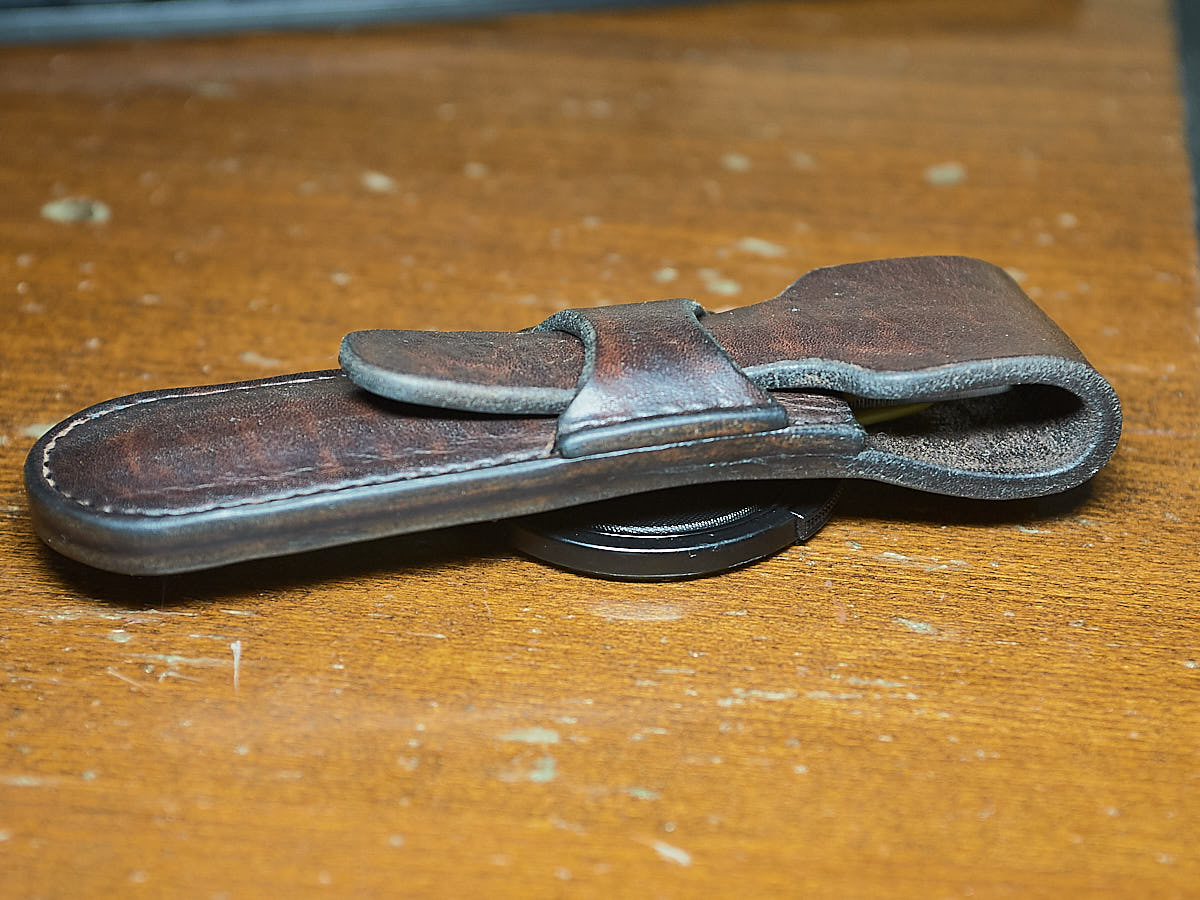 Кожа неизвестного донора, наверное техническая какая-нибудь, т.к. на производстве поделились. На ремни не годна, проверял, если только на ручку и верхнюю обвязку. А вот чехол получился, по-моему, ничего себе. Жесткий, очень надежно фиксирующий, но с разумным натягом отпускающий бритву. Недочеты некоторые вижу, но это первый экземпляр, пробный.