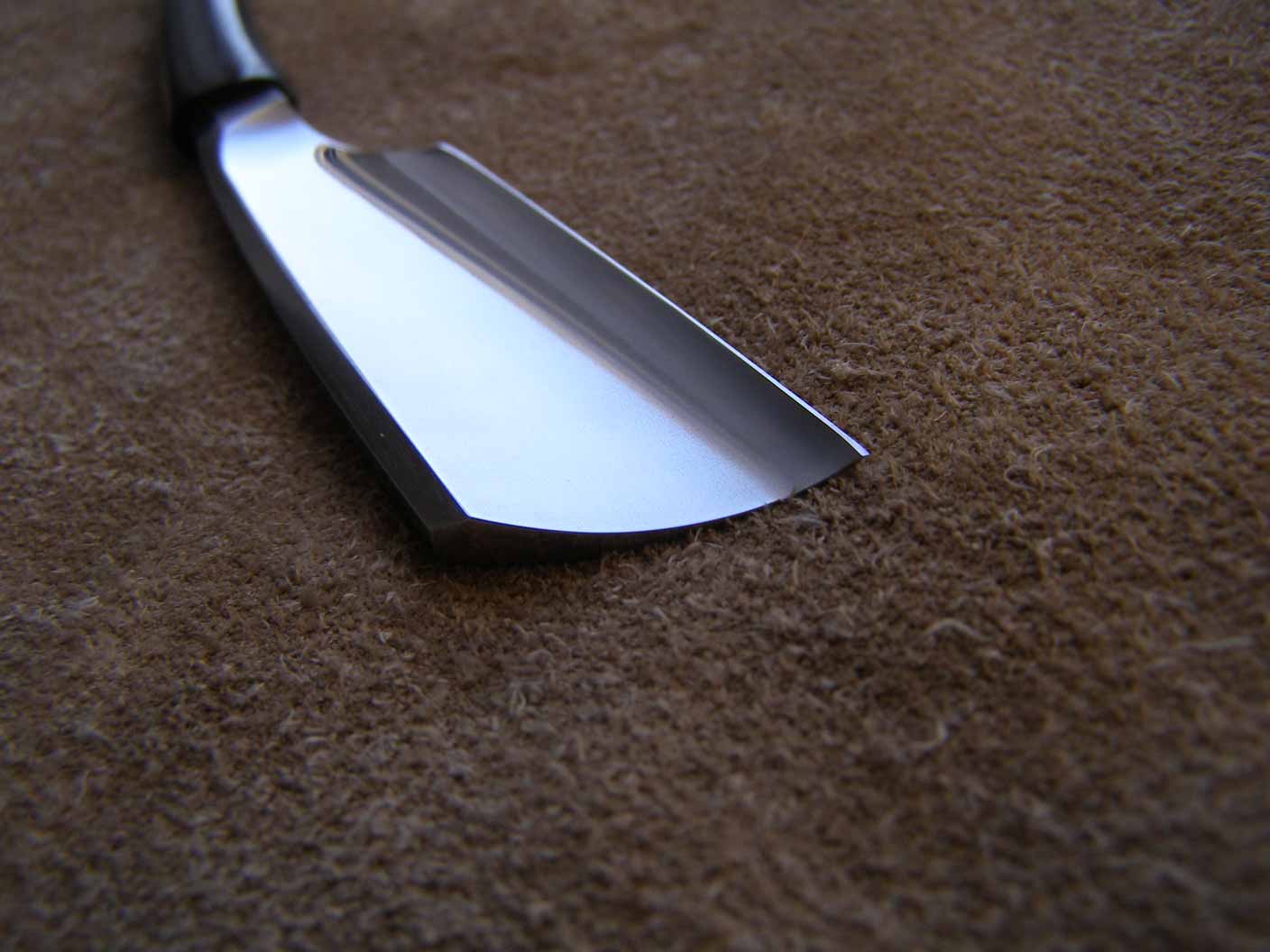 А я сейчас толко что своим чудовищем побрился....сначала с пеной из болончика пытался, но слишком скользко, рукой оттягивать кожу не выходит, и за процессом не посмотришь толком...в итоге выяснил что без именно этой пены бреет лучше, т.е. просто насухо. скаблил по одному месту раз 10 по и 10 против роста волос...в итоге щёки получились как после одноразового станка джилет(второго раза использования), а вот усы и бороду хотя и можно по идеи...но слишком трудно. Кстати раздражения щёк почти нет. Умельцы! сообщите пожайлуста насколько хорошо у вас бреют ваши произведения, и из чего и как сделанна последняя "японская" бритва! Заранее благодарю! Re: Мечтаю изготовить бритвуЕсли кому-нибудь еще интересно. Делалась с нуля, сталь 9ХФ. Ручка сделана из эбонита, клинок вклеен на эпоксидку. Пробовал бриться, с моей щетиной "Три волосины в пять рядов, ждать пока вырастет 1,5мм надо три дня" не удобно. Еще несколько фото.