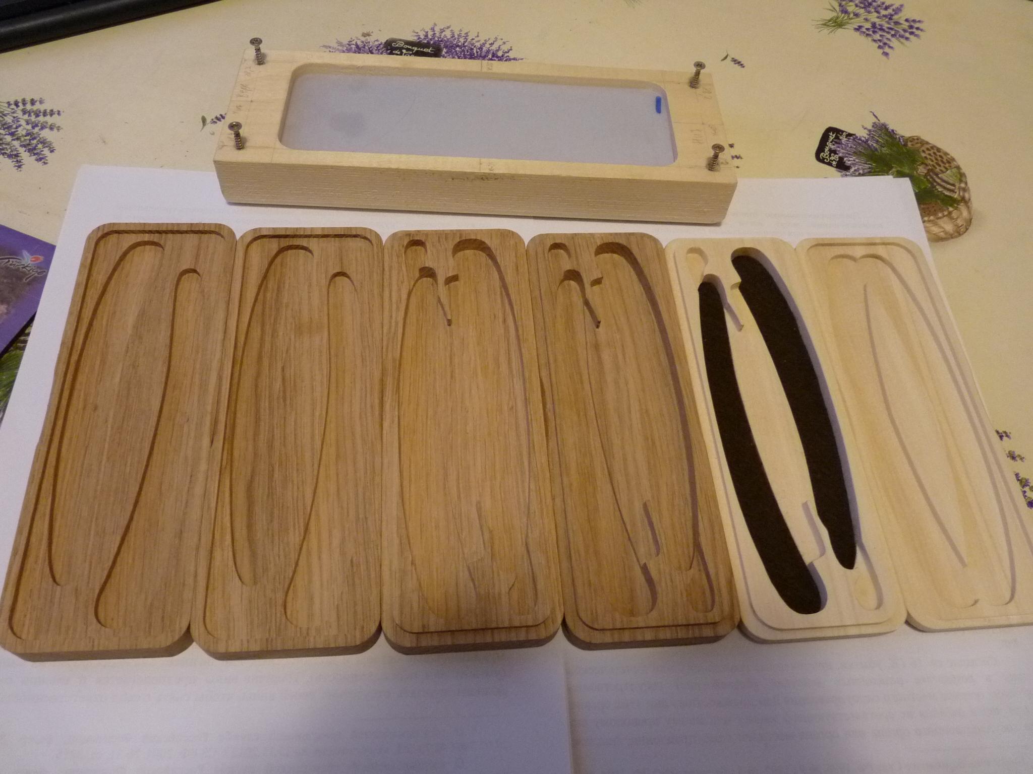Re: Футляр для опасной бритвыПродолжая тему "командировочного" пенала на 2 бритвы, добавил для сравнения ещё 2 недоделанных пенала из дуба, а также: