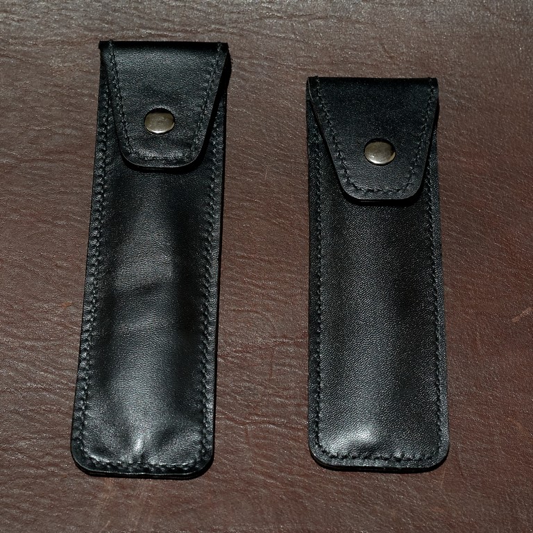 Но оборудования у меня нет, а несколько бритв без домов есть, что не очень хорошо. Увидел на "Авито" кожаный чехол, сработанный в Англии, подумал, что и мы такое можем, ну и.. Вот. Кнопки с бритвой не контачат, в одном чехле приклеена вставка изнутри , а в другом кнопка вообще вынесена на накладку. Мне нравится -))