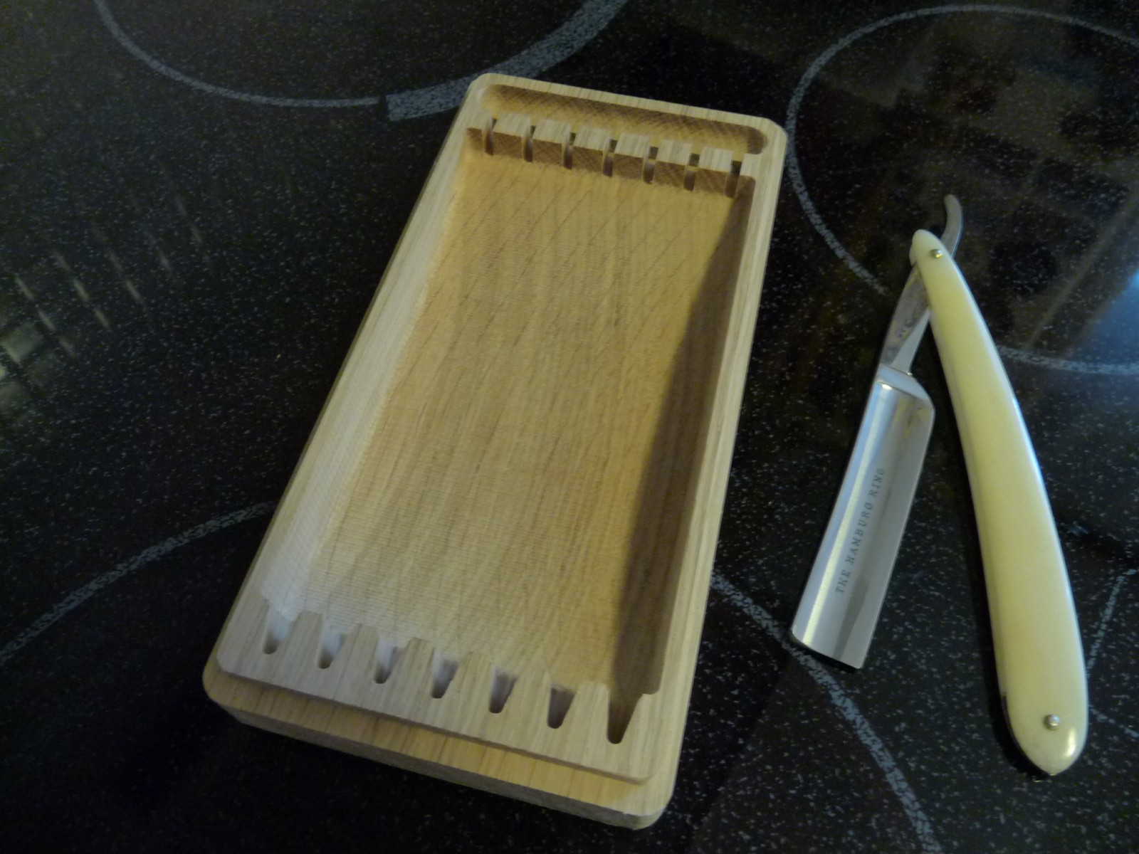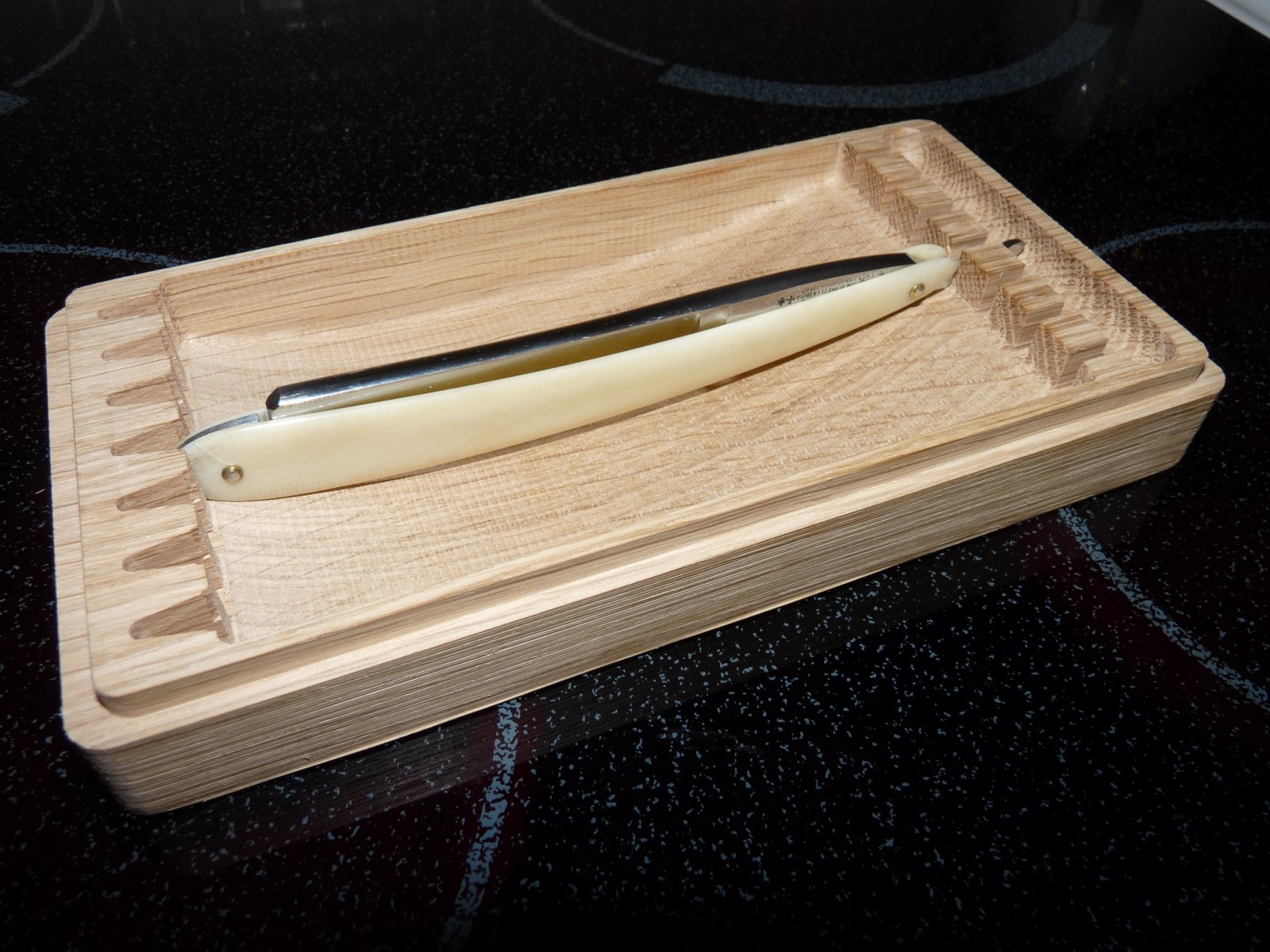 По задумке хотелось чтоб подходил он под 7 "англичан" (с тонкими костяными ручками), а также и под 7 бритв много распространённых, типа бритв СССР (если нет семи одинаковых англов), то есть с большой степенью универсальности. Пока сделал(выпилил) только низ/короб, крышку доделаю, как получится. Дуб. По сравнению со вставками (под бритвы для коробок декупажных), которые я делал ранее, тут довольно компактный кофр получился за счет того, что тут расстояние между бритвами (между осями) 11 мм (ранее было 14мм). А у тонких англов видел и ещё меньше - до8мм!!! (потому у них их тонкие слоны - ручки у пинов и трещат) Итого, ширина внутри между стенками = 78мм, наружный габарит - 90х182мм. Подходит под почти все типажи бритв 5/8 и небольшие 6/8, но с не толстыми и не очень длинными ручками, и даже бритвы с весьма кривыми/изогнутыми ручками (есть такие) советские хорошо входят и сидят. Понятно, что это не доведенное изделие - только из-под станка и немного снял напилой острые углы/заусенцы - заготовка в общем то. Днище сделано рельефным, повторяющим спинку самой гнутой бритвы - типа ЗТВ без второго пина, например "Утро", "Яхта" и т.д. Вынимать бритвы можно как взявшись за клин (спинку/обух), так и пальцем с торца за конец танга - удобно. Стенки боковые короба - 6мм, торцы потолще. Габаритная высота - 23мм. Высота сопрягаемых поверхностей - 2,8мм... Если у кого есть идеи, например, как/какой сделать крышку - готов слушать внимательно, а также критика приветствуется. PS вот сейчас думаю, что неплохо было бы сделать мелкие фаски на всех углах внутренних по верхним граням если... да может быть и выемку под палец для открывания... поспешил ить, надо было чтоб постояла на станочке штучка... Ну да это решаемо иначе тоже...