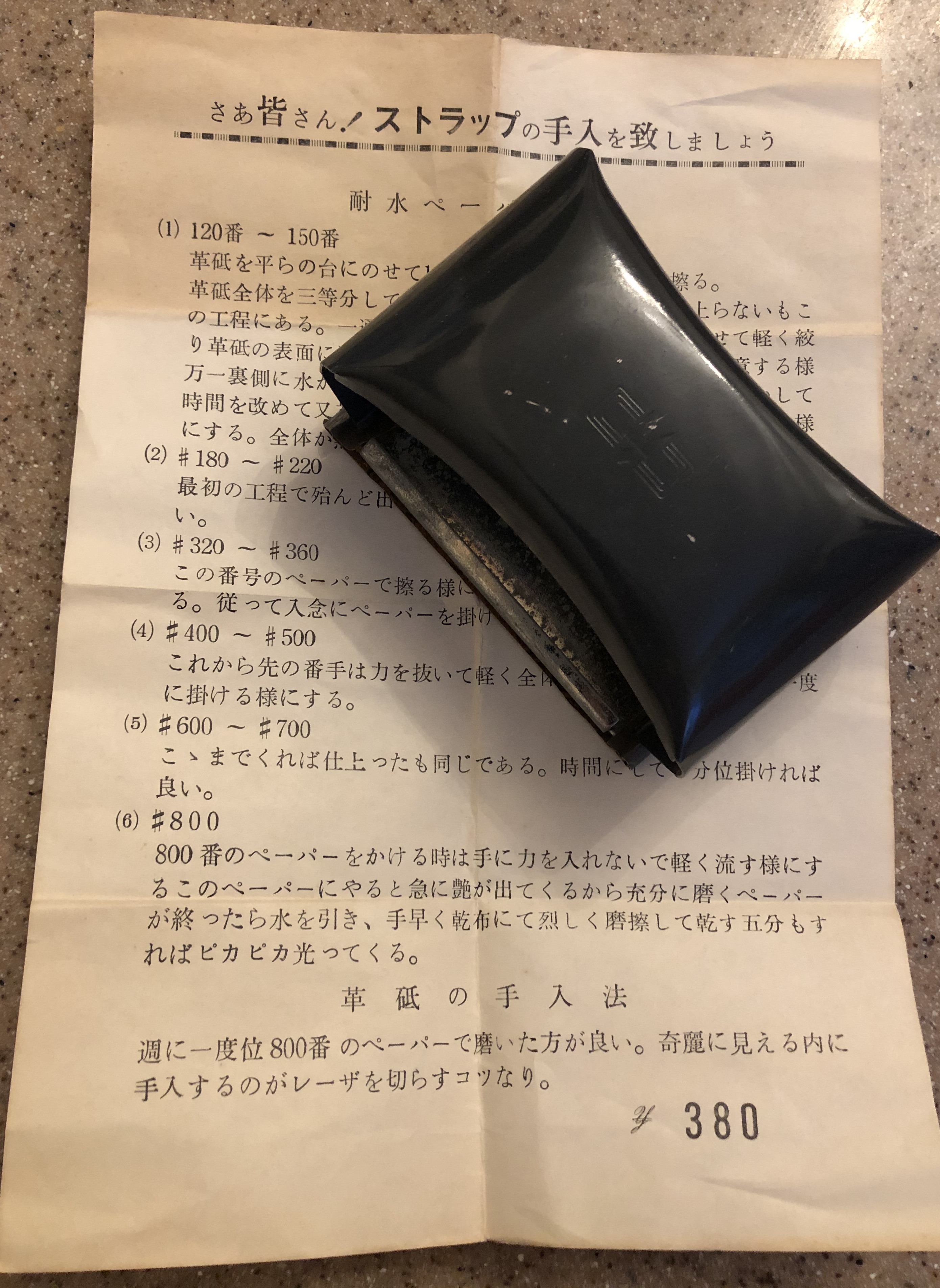 Понятно, что смысл текста инструкции пересекается с Ивасаки, но все же...Может кому и пригодится, да и оригинальная инструкция от производителя тоже очень хорошо. "Дамы и господа! Давайте изучим как ухаживать за ремнем. Способ применения водостойкой наждачной бумаги. (1) №120 ~ №150. Положите ремень для правки бритв на плоскую ровную поверхность (подставку) и трите бумагой №120 ~ №150. Трите, разделив весь ремень на три равные части. Именно этот ход работы решает кожа будет обработана хорошо или плохо. После этого смочите хлопчатобумажную ткань водой, слегка отожмите и увлажните внешнюю поверхность кожи. В это время следите за тем, чтобы не намочить заднюю сторону. Если вода просочилась на заднюю сторону, остановитесь, хорошо просушите заднюю строну и через какое-то время начните сначала. Намочите водой и хорошо потрите там, где кожа выглядит белой. Если все выглядит тёмным, основы первого процесса окончены. (2) #180 ~ #220 Его следует равнять по тому же порядку, который практически завершен на первом этапе. (3) #320 ~ #360 Если тереть бумагой под данным номером, то уже выяснится, хорошая кожа или плохая. Следовательно, накладывайте наждачку осторожно. (4) #400 ~ #500 Теперь, не прикладывая никаких сил, слегка потрем лицевую сторону, от начала и до конца, все сразу. (5) #600 ~ #700 Если вы зайдете так далеко, ремень будет как новый. Потрите таким же способом, около 3х минут. (6) #800 Когда вы трете бумагой #800, не прикладывайте никаких сил, легко скользите. Когда вы работаете этой бумагой, с момента появления блеска, заканчивайте шлифовку и быстрыми движениями, тщательно вытирайте кожу сухой тканью. Через 10 минут растирания кожа насчет сиять. Способ ухода за ремнем. Раз в неделю шлифуйте наждачной бумагой #800. Ключ работы с кожей - поддержание ее в хорошем состоянии." (Перевод Воронцовой Вероники) Всё будет ХОРОШО...тел:+79065827134