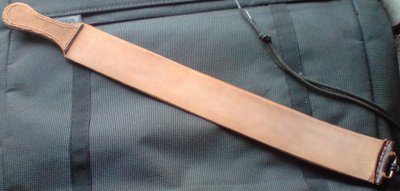 Купил с помощью форума Артбритву и восстановили мне старенький Восток-3. Посему стал вопрос о ремнях. Для заточки ножей есть разные куски кожи с ГОИ, но для бритвы этого маловато. Поэтому купил старый солдатский ремень, зашкурил кожу и сделал вот такие ремешки. Длина рабочих частей чуть больше 30 см. Первый двухсторонний без паст. На какой стороне править - скорее всего с замшевой стороны. Но на всякий случай зашкурил и лицевую сторону. Второй односторонний для ГОИ. Т.к. фурнитуры у меня нет, то ручки пришлось сшить из 2 частей для утолщения. Также пришить и пряжки. Пряжки для крепежа тоже попавшиеся под руку.