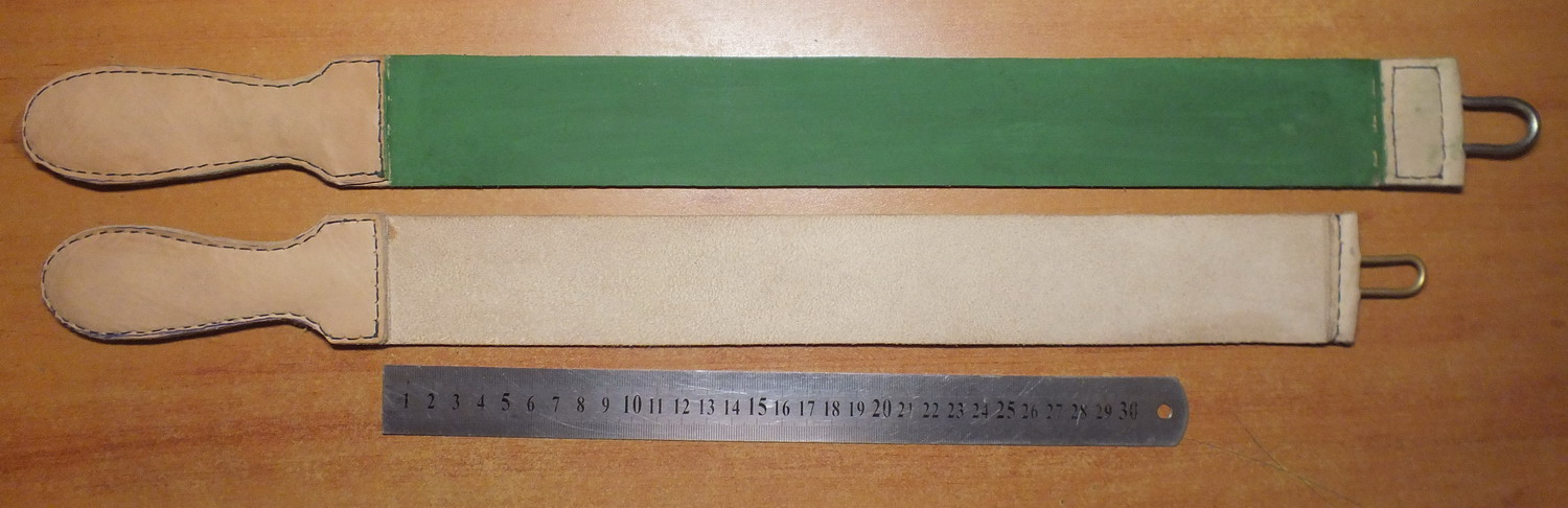 Сваял себе два ремня, точнее себе и сыну. Первый сделал в начале декабря и уже юзаю вовсю. Второй сшил вчера в воскресный вечер. Кожу заказывал здесь: http://cutler.su/leather/remennaya-zagotovka/" onclick="window.open(this.href);return false; Пришли две полосы 150х5 см. неокрашенные. Кожа ровная по толщине и ширине. В некоторых местах есть складки от чрезмерного сгибания "на лицо". Складками пустил на место для удержания. Кожаных ремней изготовил много, разных и пришел к выводу что металла в ремне должен быть минимум. И тот должен быть вне досягаемости РК, поэтому металлическая в моих ремнях только скоба для подвешивания. Остальное только собственно кожа и вощеная нить. Большой ремень 5х61 см., рабочее поле 5х40 см. Малый ремень 5х55 см. рабочее поле 5х38 см. Ручка для удержания из двух половин с мягкой кожаной вставкой внутри по форме ручки. Вот собственно сами ремни. Большой с бахтармяной стороны пастирован ГОИ №1, малый пока без пасты. ПЫСЫ: Естественно кода обработана наждачкой от 400 до 2000 32 года активно мусолю харю клинковой бритвой
